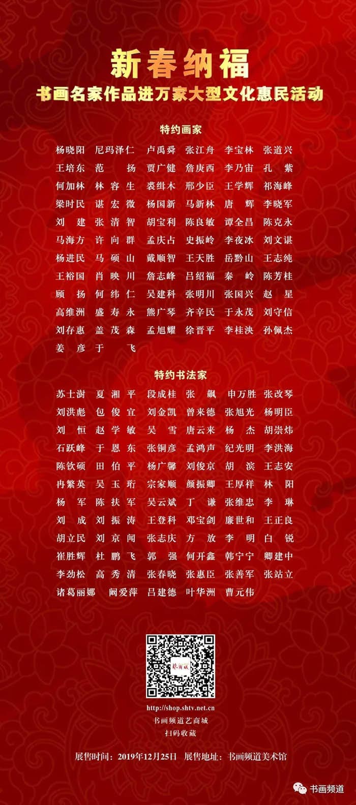2019年12月25日至2020年2月23日,“新春纳福--书画名家作品进万家”大型文化惠民展售期间,收藏书画作品(不包含教学、衍生品、文房等)单笔订单金额≥两万元,即可获得一次0元选购限量“福”字的新春纳福尊享权利,限量福字售完为止。