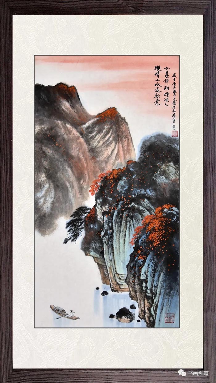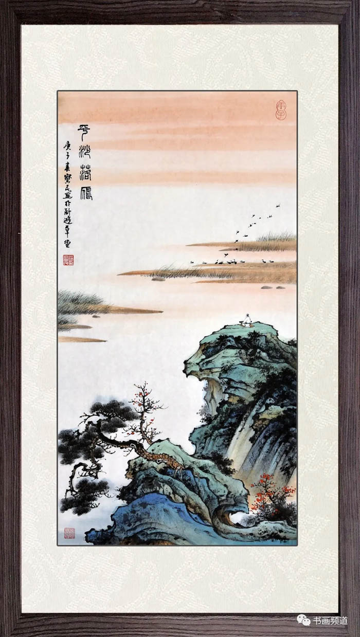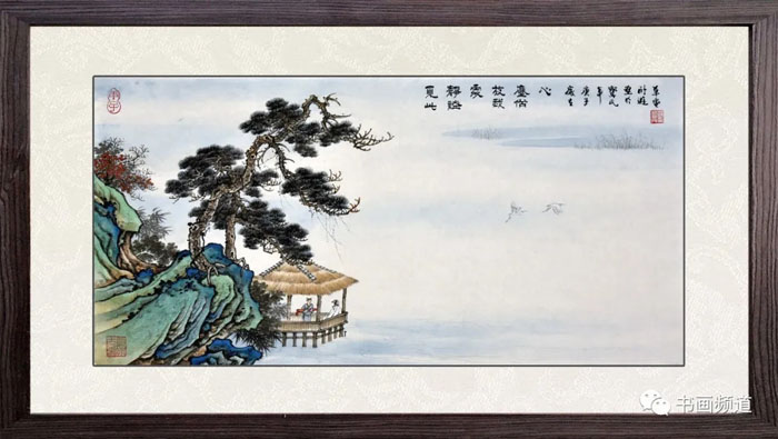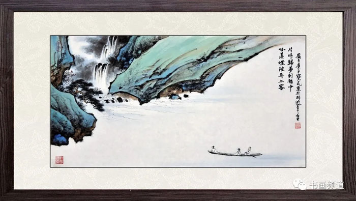 他的画作《雨歇平湖满 秋风送轻舟》,画面清净、悠远,全幅以青绿色为主,来表现色泽艳丽的丘壑林泉。天空的背景用淡赭大面积烘染,远处的山峦绵延起伏,近处笔触细致,山体空钩表现出其岩石的质感,构图疏密得当、各种景物元素穿插有致。画面之中苍松挺拔、草木依依,友人坐于凉亭之中,畅怀交谈,一位长者乘舟逶迤而来,传达了作者一种寄怀山水苍茫境,醉我烟霞浩荡心的内心感受。