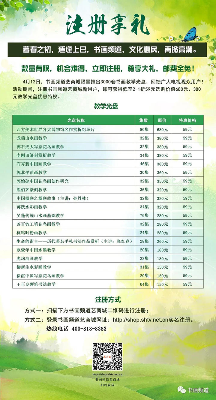 4月12日,书画频道艺商城限量推出3000套书画教学光盘,回馈广大电视观众用户!活动期间,注册书画频道艺商城新用户,即可获得低至2-1折59元选购价值680元、380元教学光盘优惠特权。