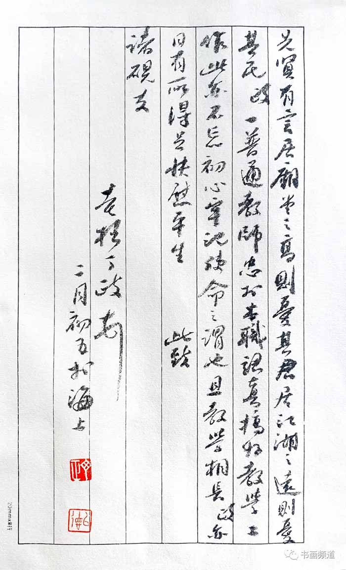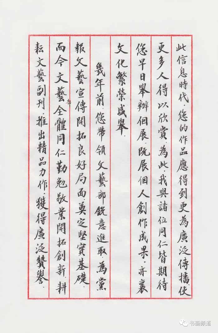 光阴荏苒,转眼已是春回大地。我和文艺部同仁也时常惦念您,时常回忆起您挥毫泼墨情景。作为书画名家,中国美协、中国书协双理事,您诸体兼擅且长于丹青。您的艺术造诣、您对艺术的执著追求令人钦佩。值此信息时代,您的作品应得到更为广泛传播,使更多人得以欣赏。为此,我与诸位同仁皆期待您早日举办个展,既展个人创作成果,亦襄文化繁荣盛举。