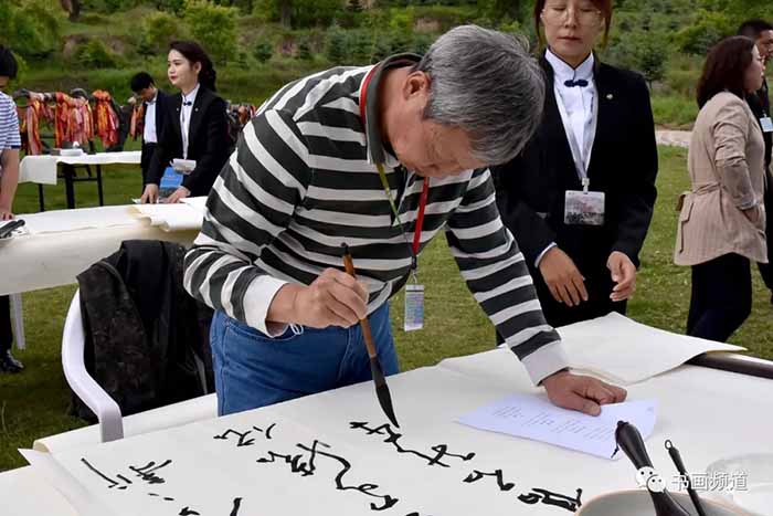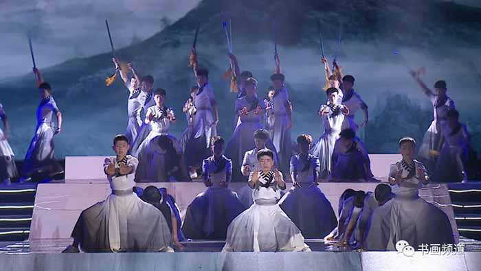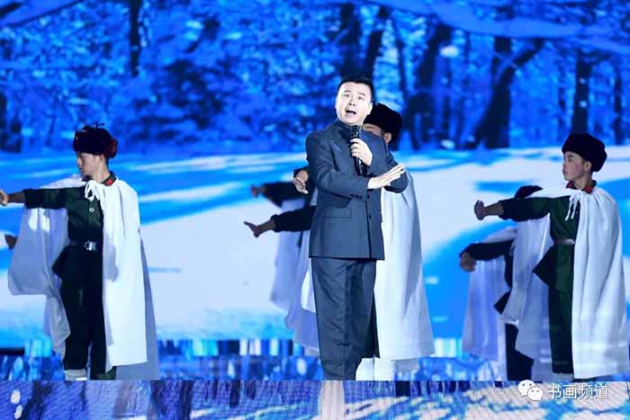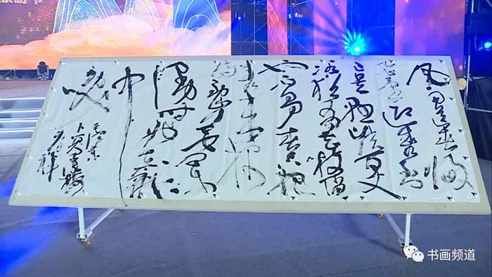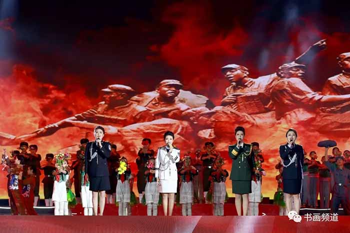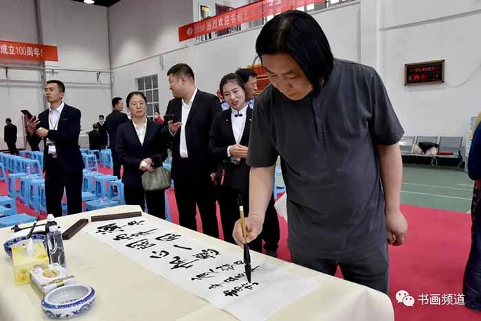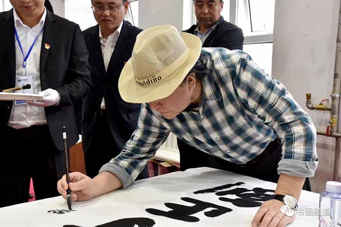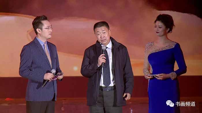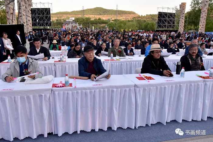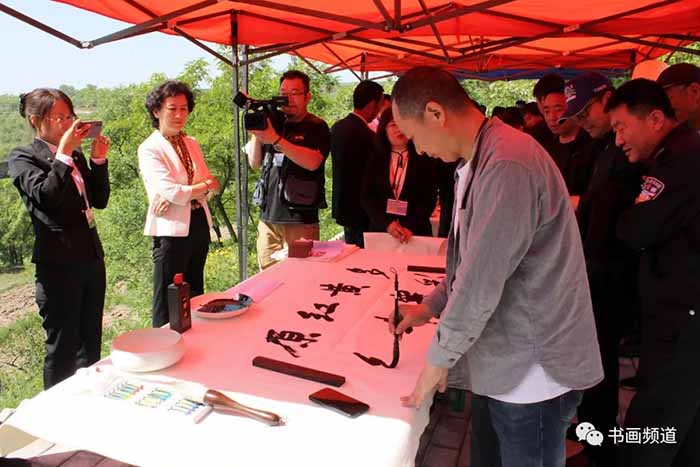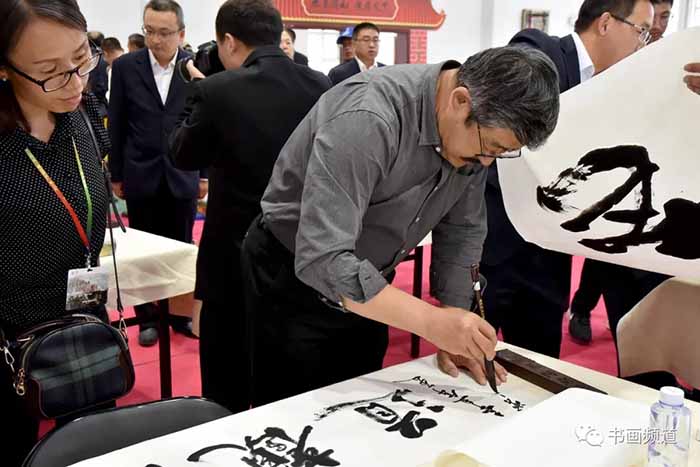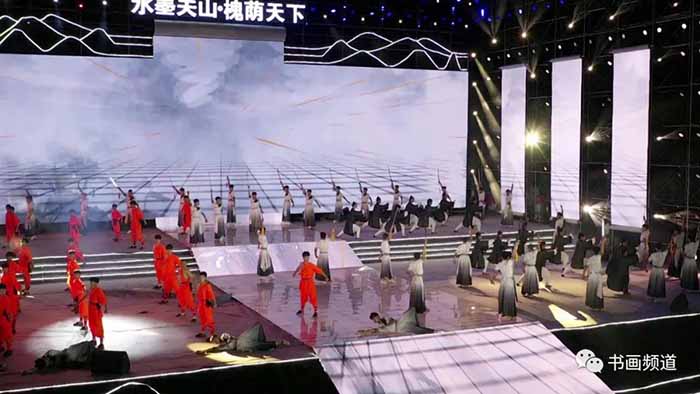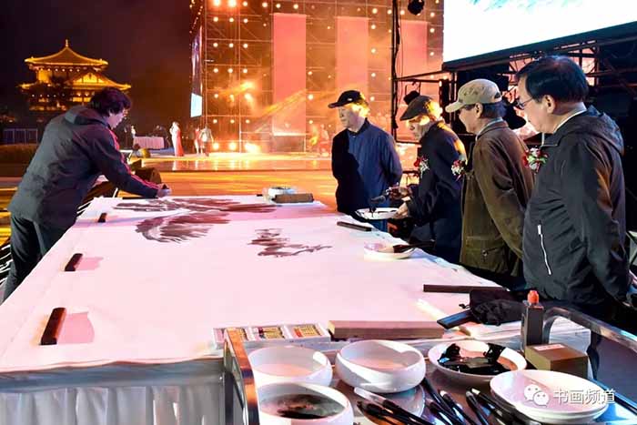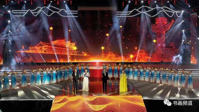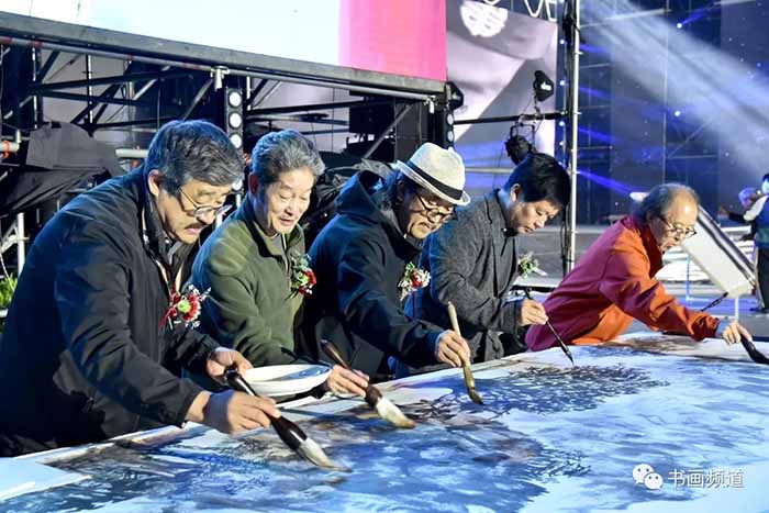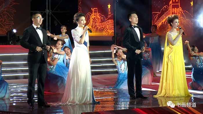 在精彩的歌舞表演中,著名书画艺术家王学辉、王利峰、谌宏微 、祁海峰、胡宝利、裘缉木、杨国新、戴顺智、李晓军、于新生走上舞台,用精彩的笔墨现场激情创作,以浑厚的画卷描绘平凉新时代的新辉煌。