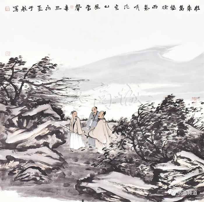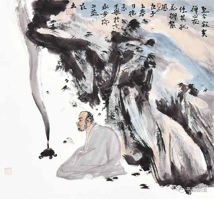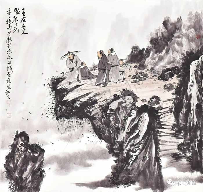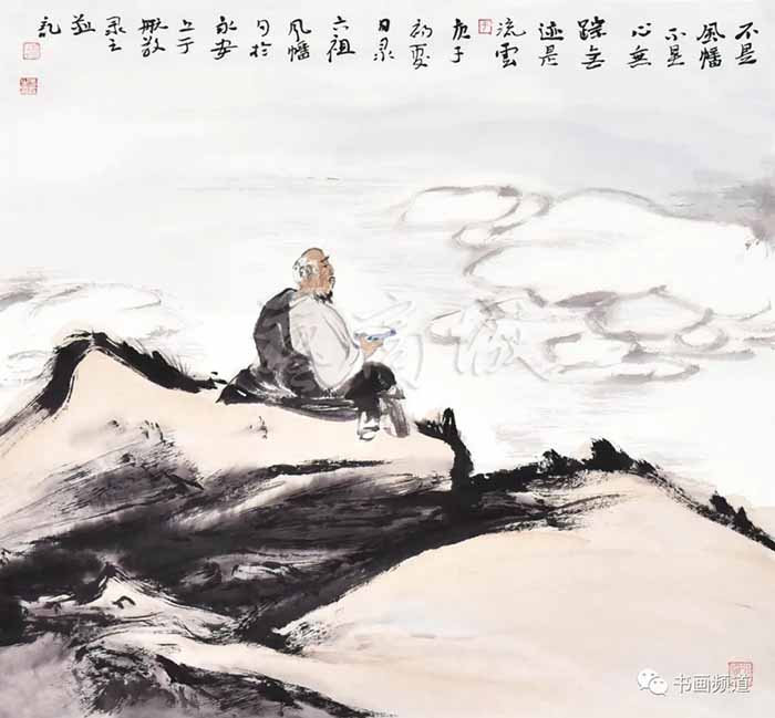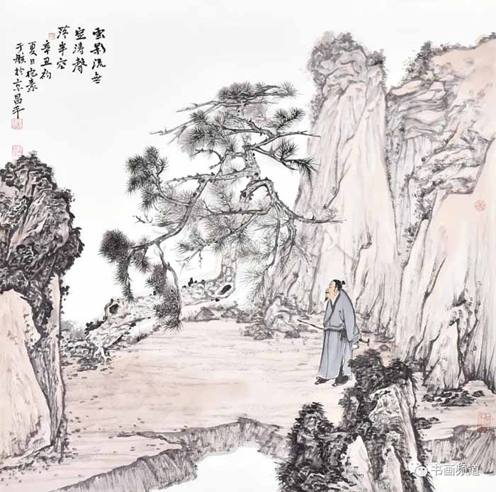 在于航的三十余载绘事生涯中,他的艺术理想世界总是意在笔先,让思想智慧的神思迁想妙得,提前注入他的一幅幅精品佳作——大美入画不拘传统画种形式与分类,汲取多方修为而凝注于个性笔下,行笔散怀抱、潇洒游于艺而又于画面精妙处各有不同凡俗的变化之新妙。本次于航先生为艺术惠民创作的国画作品,便呈现出其理想之境界。状若人性极致美的山峦,云水禅音缥缈的神奇,神山之中居三五得道高人仙者,苍松蓊郁、杂树曼妙丛生,厚重高远之中又有着无穷尽的灵秀飘逸之韵。第一眼看到的景物,往往有令观者感官上的新奇和极大的视觉冲击力,那般全新的造境笔墨线条皴法语言,新、奇、妙!山岩嶙峋,多见千古岁月深切印痕;云水碧蓝,彰显智慧绘者纯净胸襟。远观,就能被绘者所营造的梦想家园那种宏大气象和道禅静雅,所深深打动。
