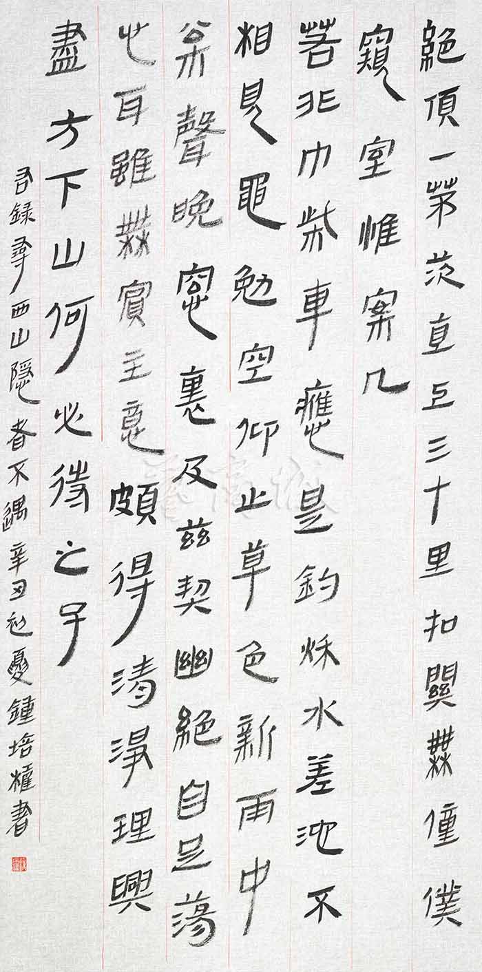 历代著录甚多的碑帖,礼器并有隶书第一美誉之称,其书风雅逸,端庄秀美,古拙劲挺,稳健遒劲。钟培权的隶书以礼器为基调,在张迁、乙瑛等碑帖中也有所学习,在其创作隶书时,意在笔先、胸有成竹,心神合一、一气呵成。