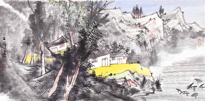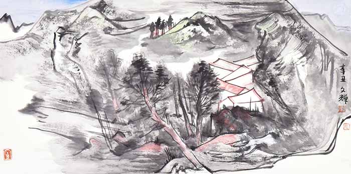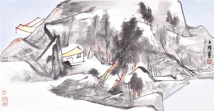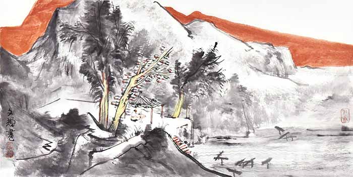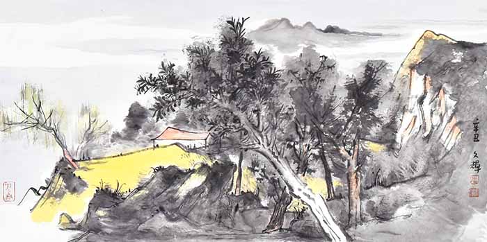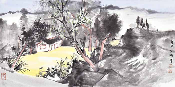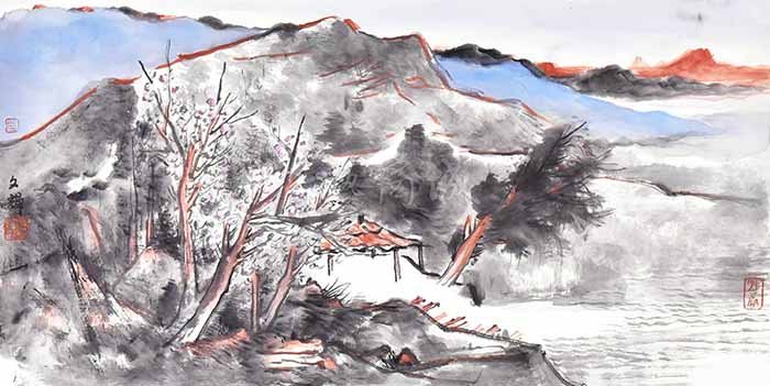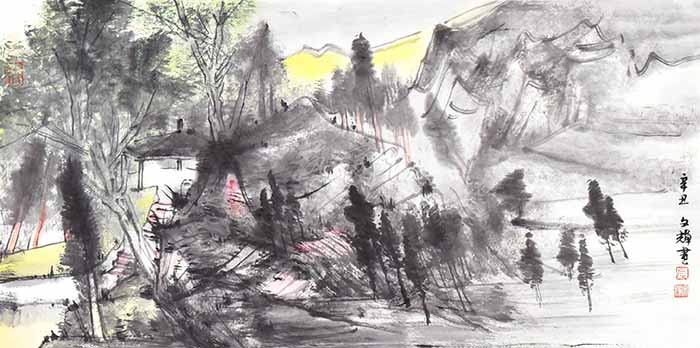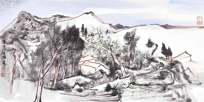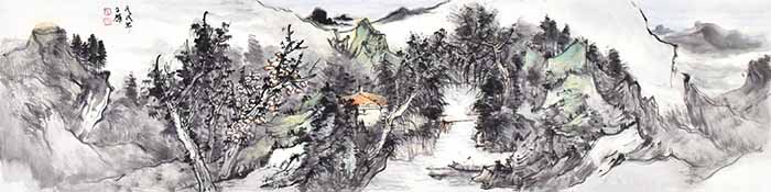 在本次左文辉创作的山水作品中,画面采用展开式构图,远山近水,空间开阔,重峦叠峰,层次清晰,茂林佳树,历历在目,虽然有许多江南山水常见的景物,但已经奕破了“小桥流水人家”、“杏花春雨江南”的小格局,呈现出类似“塞下秋来风景异” 、“千嶂里,长烟落日孤城闭”的大境界,带有北派山水的高峻雄浑气势。