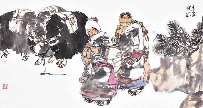 “面对丰富的生活景象,每个人的理解和喜爱都会不同。在题材的选择上,我主要侧重于西部地域特色的挖掘,表现我比较熟悉的高原藏民生活。”李伟坚持从甘肃的自然风貌和民俗民情中提练绘画语言,敏锐地捕捉感动心灵的审美素材。其笔下的甘南藏区风情画,浓墨巨笔,大块的黑墨中透着空灵,冷默静滞中夹藏着神秘,传神写心,风貌独具。作品笔墨浑厚,构图奇崛,充满悟性和灵性,体现出其高超的山水写生水准和与众不同的艺术观念。其笔下的人物形象表情无丝毫矫揉造作,自然而不拘束,有着永恒而且优美的审美特点,能够让观者增加对其生活状态、生活经历的联想,同时也使画面内涵变得丰富起来。