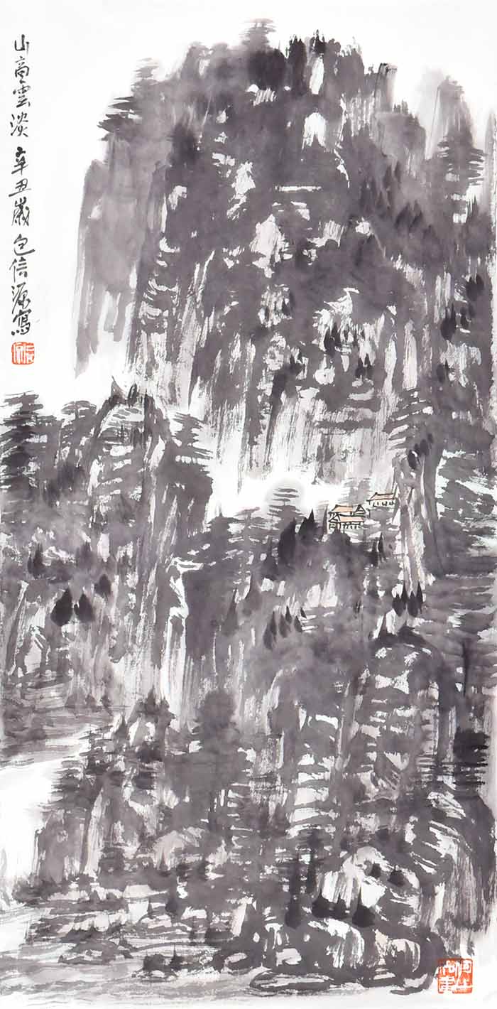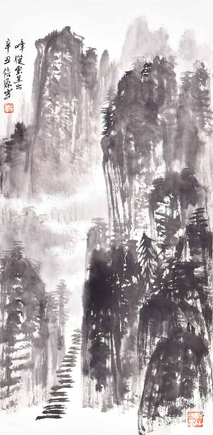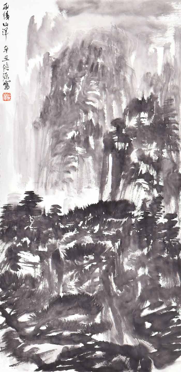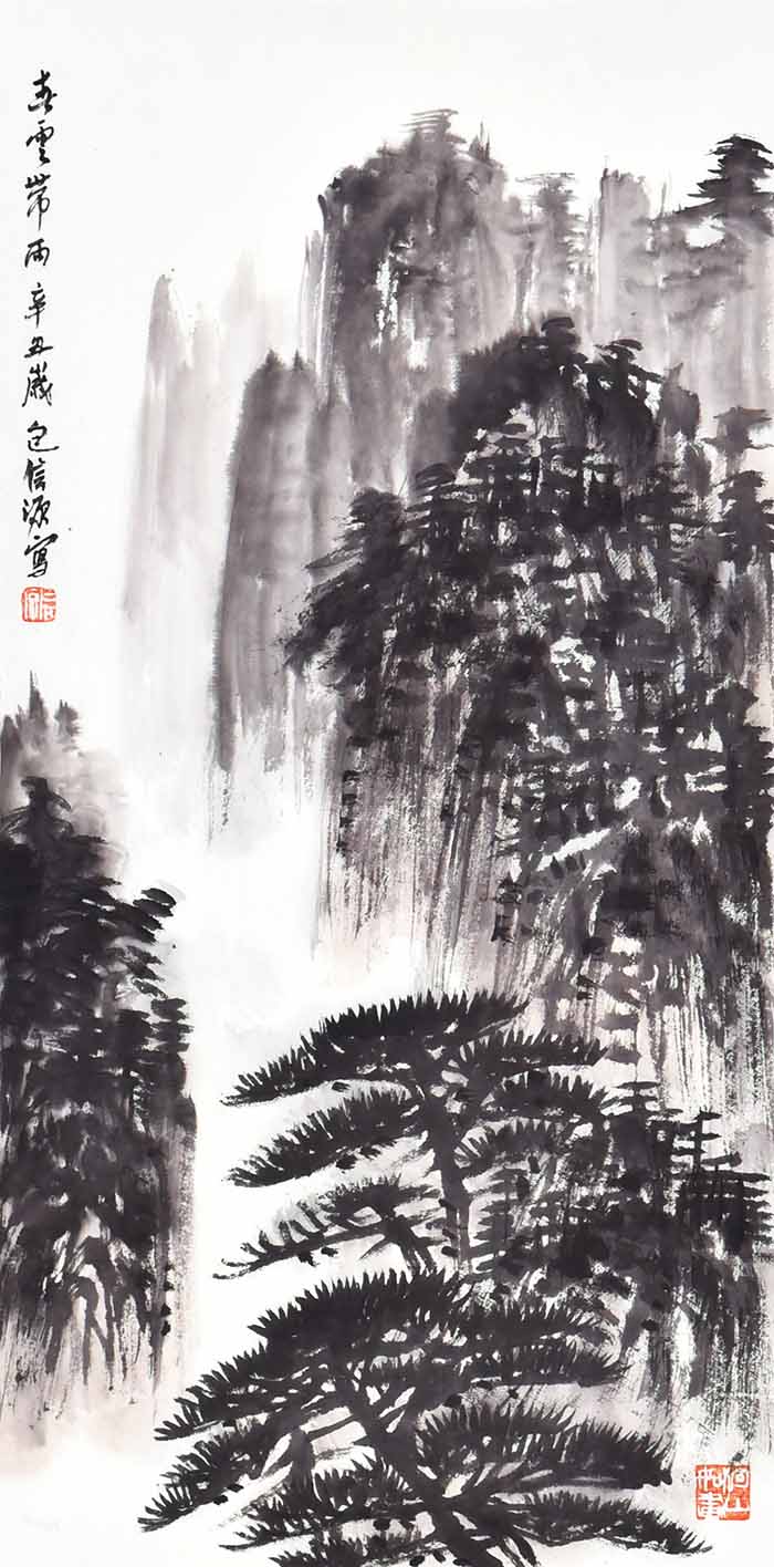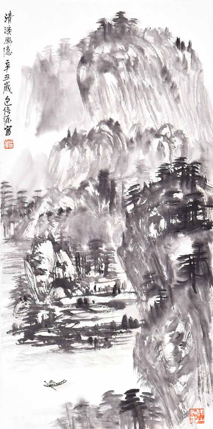 在包信源的山水画面中,云雾、烟雨、扁舟等自然意象反复出现,诗意朦胧,水墨淋漓,令人叹为观止。画面上更是亦真亦幻,笔随心运,潇洒自然,无形胜于有形,无意源于有意,令人不禁啧啧赞叹。