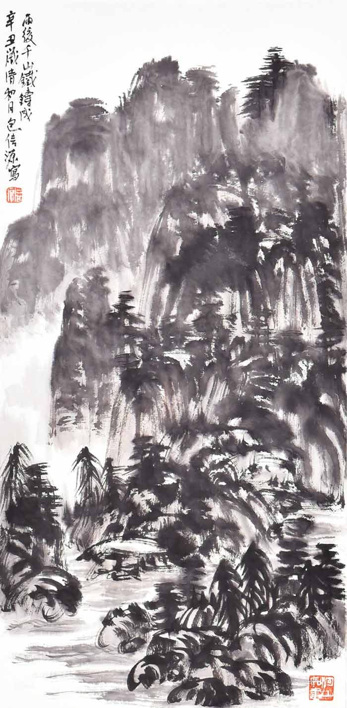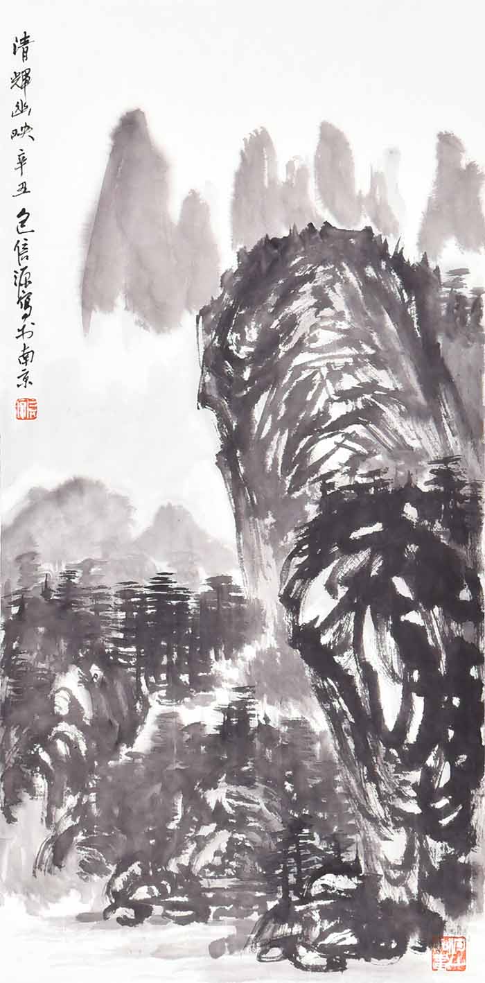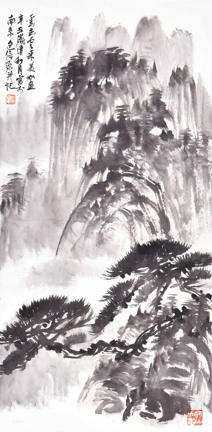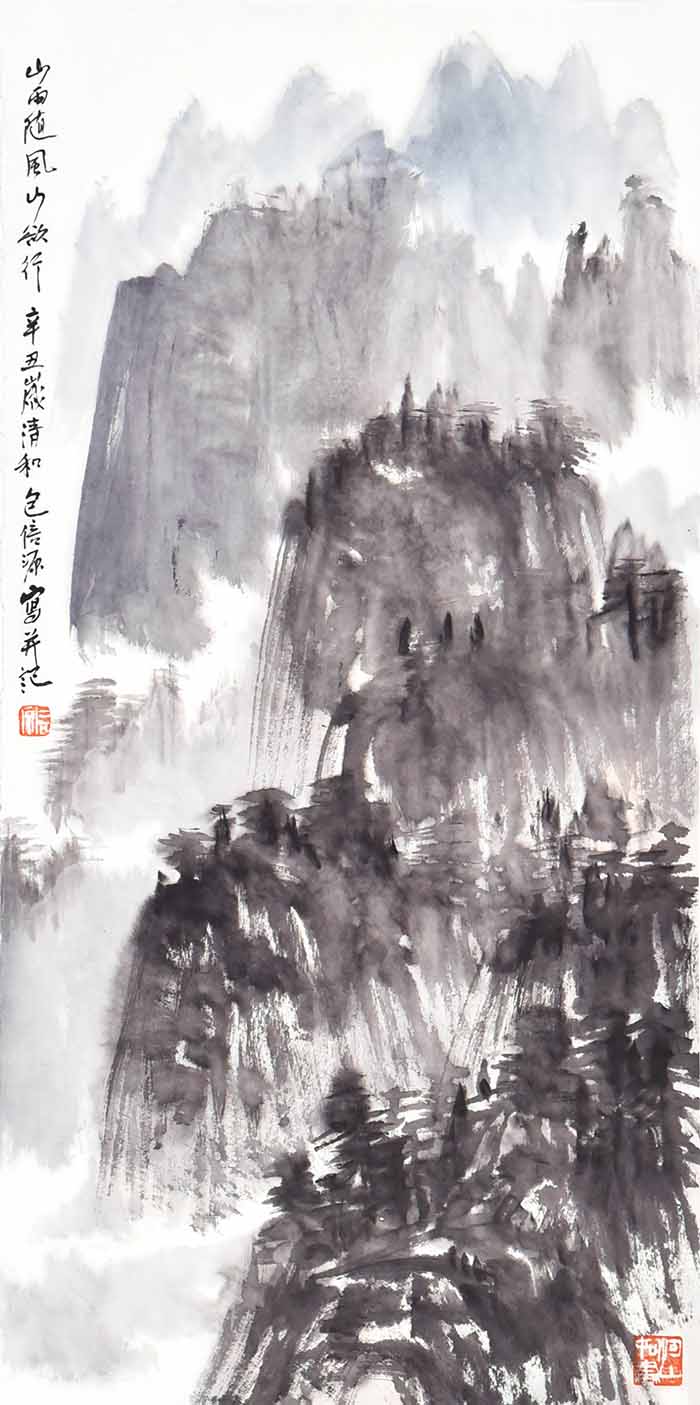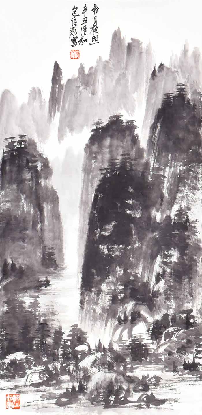 在包信源的山水画面中,云雾、烟雨、扁舟等自然意象反复出现,诗意朦胧,水墨淋漓,令人叹为观止。画面上更是亦真亦幻,笔随心运,潇洒自然,无形胜于有形,无意源于有意,令人不禁啧啧赞叹。