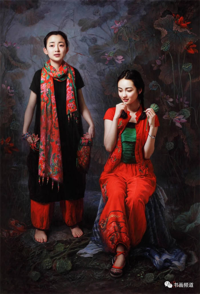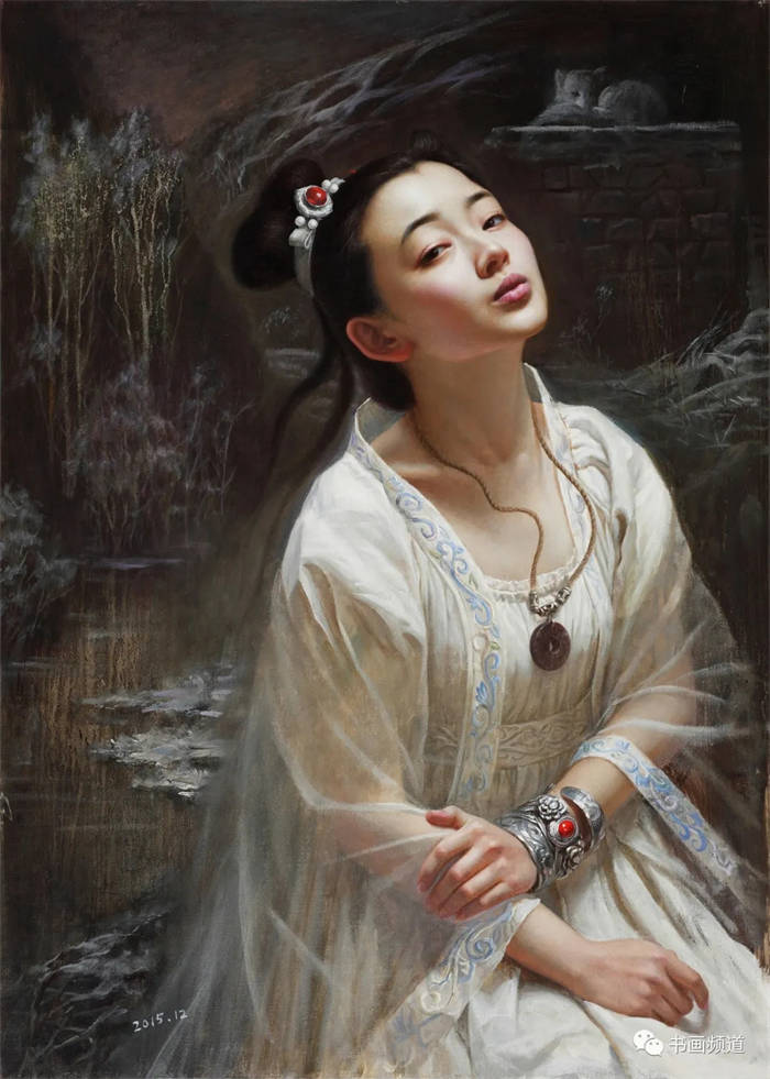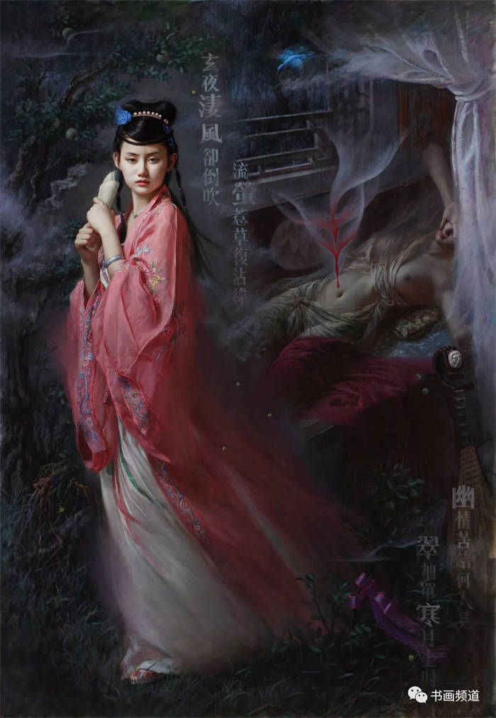 如何更好地通过油画艺术展示“中国形象”、讲好“中国故事”是学术界与创作者共同关注的时代课题。安静并未满足于以多姿多彩的青春形象展示新一代中国青年精神风貌,而是不断地学习探索,将艺术触角伸向数千年的中华历史文明,她以写实油画中的青春倩影风姿与周围的景物展示二十四节气的时令变迁,《夏至》、《处暑》、《白露》等作品中的中华文化符号与画面中富有特色的人物形神完美吻合,使观者在其作品前会随着移步不同的画作,而深切感受到季节的变迁与浓郁的北方地区传统风韵。用画笔描绘经典文学著作一直是国画家热衷于思考与表达的途径之一,安静用油画的形式结合其善于描绘女性的特长将目光锁定于蒲松龄的《聊斋志异》,进行了大胆的创作尝试,她以大量的时间和精力精研文字内容并用心体会连琐、婴宁、小翠、黄英、香玉、葛巾、颜如玉等每一位女性的性格与灵魂。作者以瑰丽浓艳的色彩基调,造奇设幻,将唯美、奇幻、写实相结合,凸显出小说人物的形、神、韵,成功地实现了以写实油画展现志怪小说《聊斋志异》人物形象,并在其艺术人生中完成了多方面的提升与蜕变,这样的创作实践是其以油画艺术观照传统文化的展现,也是中西文化交流互鉴中的时代产物。