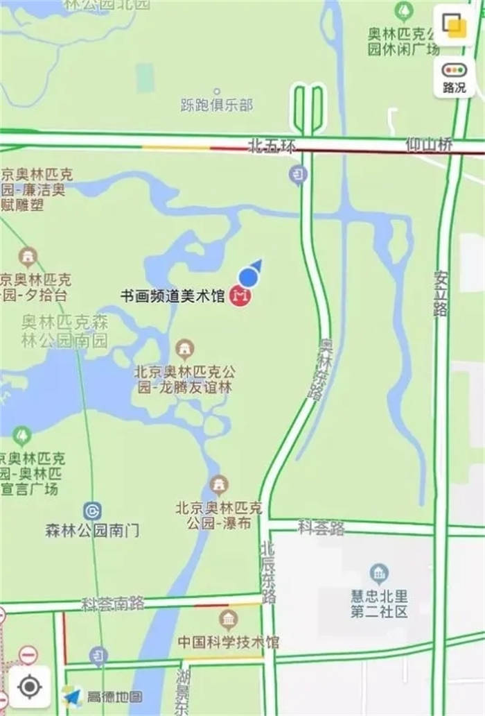 地铁八号线森林公园南门B口出,进入奥林匹克森林公园南门,右拐沿红色跑道或路标找到 “中央数字电视书画频道”或“森林艺术中心”(步行15-20分钟)。