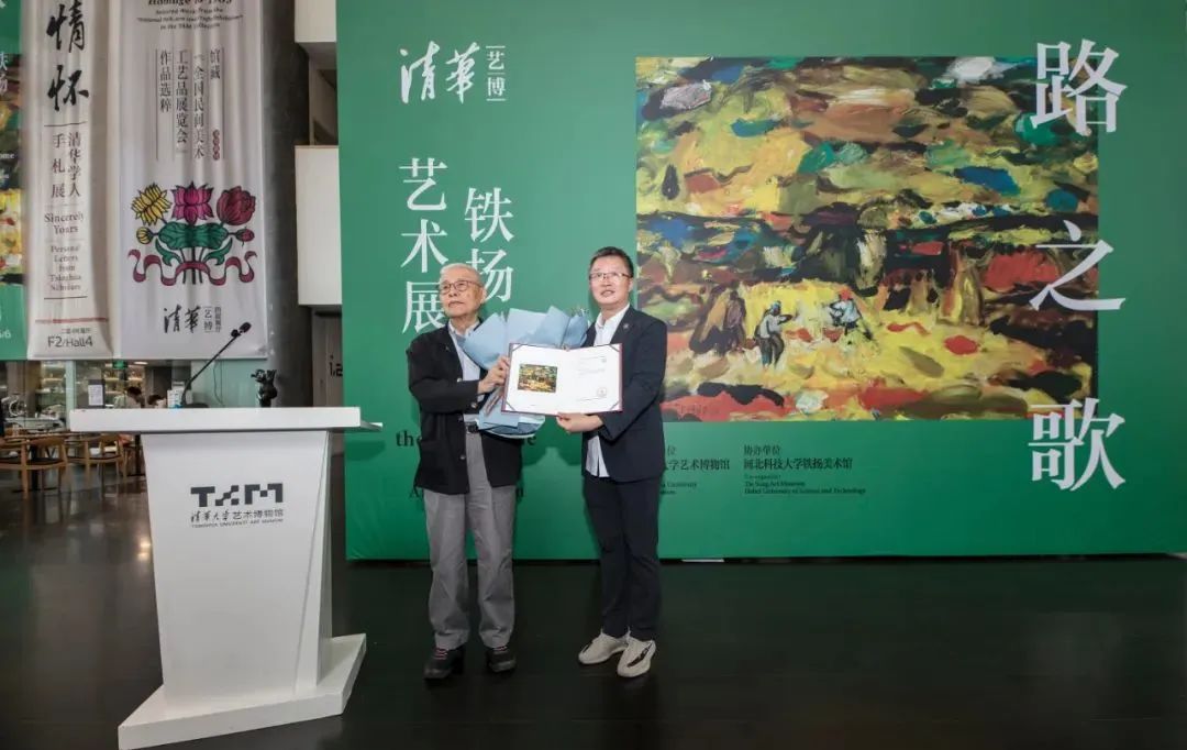 金秋硕果,桃李芬芳。2023年9月10日,在第39个教师节来临之际,适逢清华大学艺术博物馆开馆七周年纪念日,同时也是著名画家、美术教育家铁扬先生八十八岁寿辰,清华艺博迎来了“路之歌:铁扬艺术展”的盛大启幕。清华大学副校长杨斌,民盟中央副主席、中国美术家协会副主席、中国美术馆馆长吴为山,中国美术家协会主席范迪安,中国美术家协会分党组书记、驻会副主席马锋辉,河北科技大学副校长徐永赞,清华大学艺术博物馆常务副馆长杜鹏飞,艺术家铁扬先后致辞。开幕式上,杜鹏飞为铁扬颁发捐赠证书,感谢他为清华大学艺术博物馆捐赠《打莜麦》等八幅绘画作品。中国文联党组成员、副主席、书记处书记诸迪宣布展览开幕。开幕式由清华大学艺术博物馆副馆长李哲主持。清华大学部分师生校友、艺术界代表、媒体记者、社会观众等出席了开幕式。