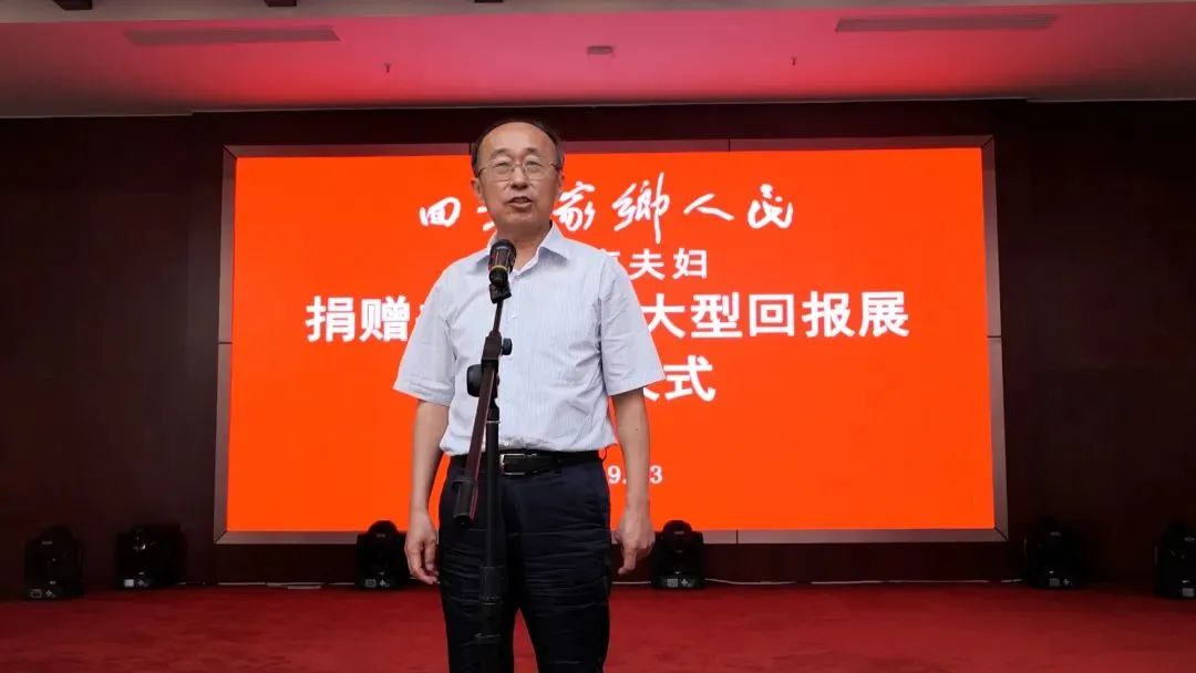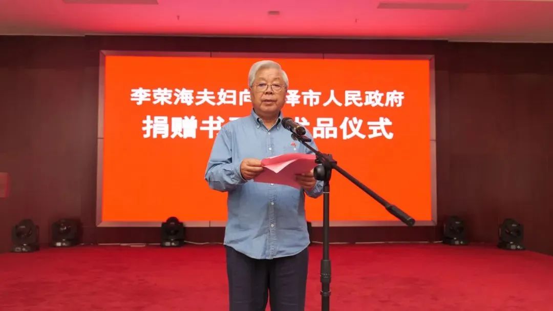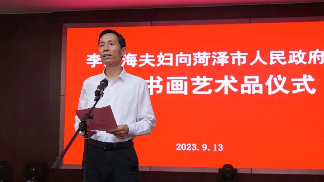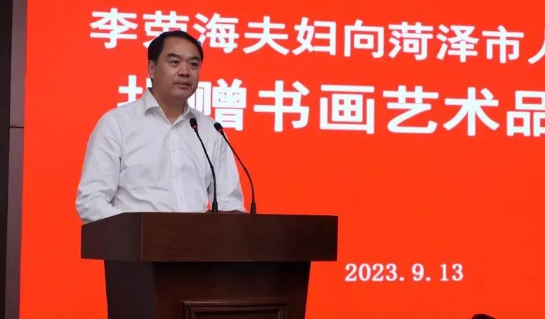 张伦在致辞中指出,李荣海先生是菏泽本土成长起来的艺术大家,在书法界和美术界享有广泛盛誉,今天将毕生创作和收藏的书画艺术精品无偿捐赠,展现了德艺双馨、高风亮节的坦荡胸怀和热爱家乡、心系故土的拳拳之情。全市上下要以李荣海先生为榜样,鼓励引导更多在外人才投身家乡建设,为实现突破菏泽、后来居上的目标汇聚磅礴力量。
