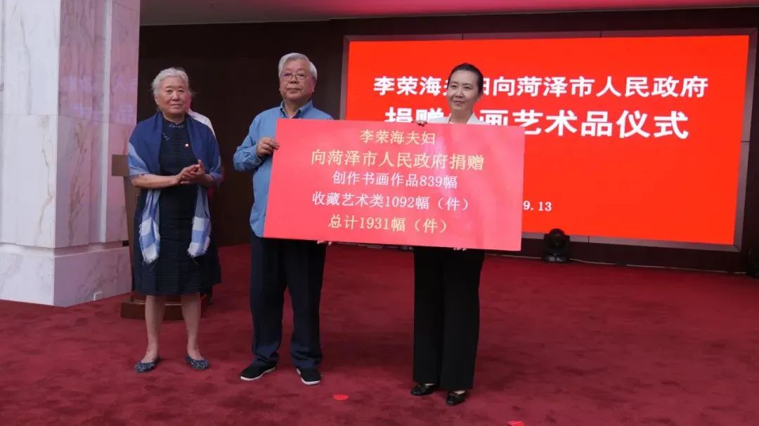 李荣海是全国著名的菏泽籍书画艺术家,取得了令人瞩目的艺术成就,为书画事业的繁荣发展和对外文化交流做出了积极贡献,古稀之年依然为繁荣家乡文化事业发挥余热。2020年7月,他把付出巨大心血、倾注深厚感情、寄予艺术追求的李荣海美术馆无偿捐赠给市政府,真正做到了立言、立功、立德。此次,他又将精心创作的书画作品839幅(件),以及一生收藏的名家书画等艺术品1092幅(件),合计1931幅(件),全部捐赠给家乡菏泽市人民政府,并在菏泽市李荣海美术馆举办“回报家乡人民•李荣海夫妇捐赠书画作品大型回报展”,更展现了一名艺术家德艺双馨、无私奉献的博大胸怀。