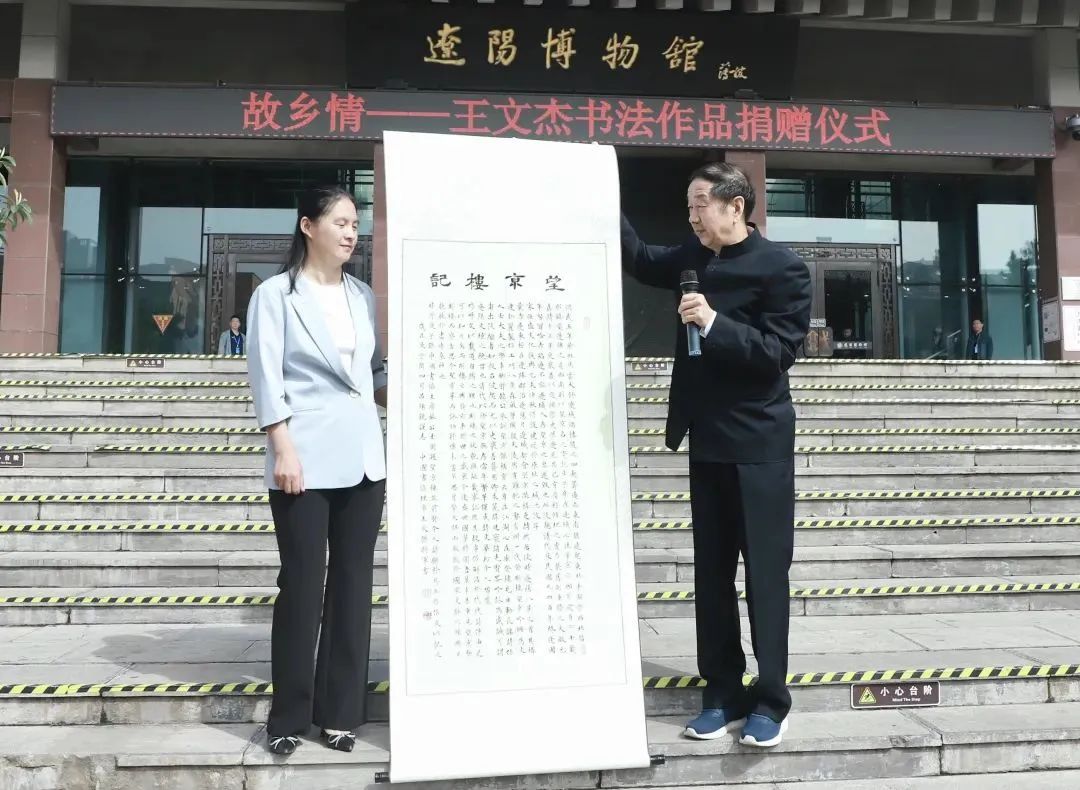 情系家乡 笔耕不辍——王文杰书法展在辽阳博物馆举行,众多领导嘉宾出席开幕式并致辞,共贺这位从辽阳走出的书画艺术家回乡举办展览。捐赠仪式上由王文杰将此次展览中长卷、册页等20件作品捐赠给辽阳博物馆并现场展示一幅书法作品《望京楼》。