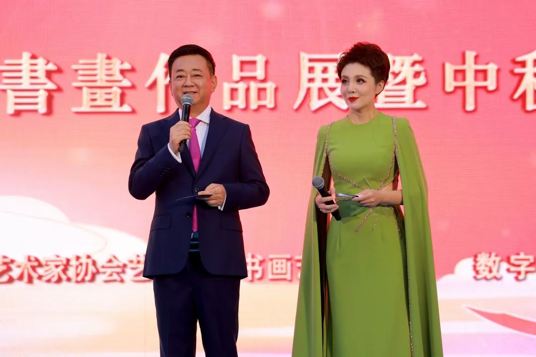 广大热爱书画艺术、卓有成就的表演艺术家,不仅在主持或表演的艺术领域深受观众喜爱,也在传统文化的传承与发展中贡献着自己的力量。戏曲是中国传统文化的瑰宝,表演艺术家们带来的戏曲联唱,让观众沉浸在戏曲的魅力中。李嘉存用气势磅礴的唱腔献唱京剧《九江⼝》,博得现场一片喝彩之声;赵保乐、李艳秋带来的黄梅戏《夫妻双双把家还》,声情并茂、婉转悠扬;胡彩虹演唱晋剧《大登殿》选段,铿锵有力、气韵十足,浓厚的传统特色在月满佳节更添民族情怀。