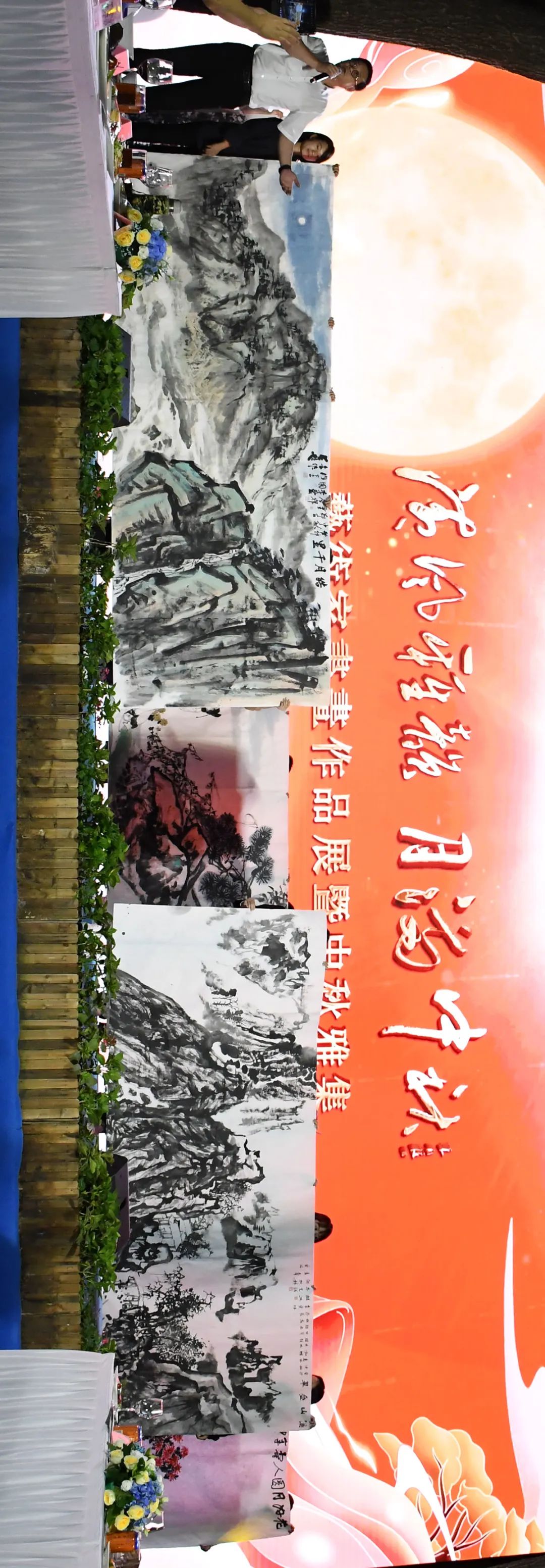 雅集现场还展示了书画艺术家们在笔会上创作的五幅巨幅国画作品,著名花鸟画家张立辰、吴悦石、邢少臣、邓远坡、贾广健共同创作的《花好月圆人寿年丰》,选取传统吉祥花鸟题材传递美好的中秋祝福;由杨晓阳、谢志高、龚文桢、纪连彬、周荣生共同创作的《天涯共此时》,在明月高悬的中秋之景中表达真挚情感;由张道兴、王同仁、李乃宙、萧玉田、王辅民共同创作的《中秋大戏》,选取戏曲元素诙谐生动地呈现了一场中秋大戏;两幅丈二山水画作品,分别是由卢禹舜、李宝林、赵卫、牛克诚、何加林共同创作的《溪山叠翠》,和由徐里、郑百重、祁海峰、唐辉、李爱国共同创作的《皓月千里》,在苍茫山水中倾述无限的山河眷恋与家国情怀。徐里代表创作艺术家在现场发表创作感怀。