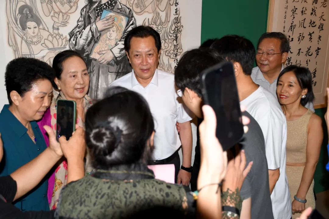 原文化部部长蔡武,中国文联原党组书记胡振民,中国文学艺术基金会理事长左中一,全国政协原副秘书长张秋俭,文化和旅游部原党组成员王晓峰,中国文联原副主席杨承志,中国电视艺术家协会原副主席张显,民建中央专职副主席孙东生,全国政协书画室副主任赵学敏,中央国家机关书法家协会副主席韩亨林,中国电视艺术家协会诗书画艺术委员会会长、毛泽东特型演员唐国强,中国电视艺术家协会分党组成员、副秘书长董涛,中国文化艺术发展促进会主席杨晓阳,中国外文局副局长陆彩荣,中国书法家协会顾问张飙,原副主席申万胜,中国美术家协会副主席徐里,中国国家画院原院长卢禹舜,中国国家画院原副院长曾来德、赵卫、纪连彬,中国艺术研究院国画院院长牛克诚,荣宝斋画院院长唐辉,天津美术学院院长贾广健,中国电视艺术家协会专委会工作处副处长裴月华,干部赵阳,广电总局传媒司许曼,全球宽带产业协会主席、中国移动书画协会主席李正茂,云南白药集团总裁、首席执行官董明,中国铁道建筑总公司原总裁赵广发,中国艺术档案学会会长陈秀华,北京世奥森林公园开发经营有限公司总经理宋超荣;著名书画艺术家张道兴、李宝林、张立辰、吴悦石、王同仁、苗培红、谢志高、杜大恺、萧玉田、张铜彦、杨明臣等;中国电视艺术家协会诗书画艺术委员会委员陶玉玲、高放、张铁林、张金玲、卢奇、李嘉存、杜旭东、李文启、王静、韩月乔、石小满、赵保乐、刘玉婉等;以及书画频道董事局主席王平,总裁李培元等领导嘉宾和社会各界代表200余人出席了本场盛会。