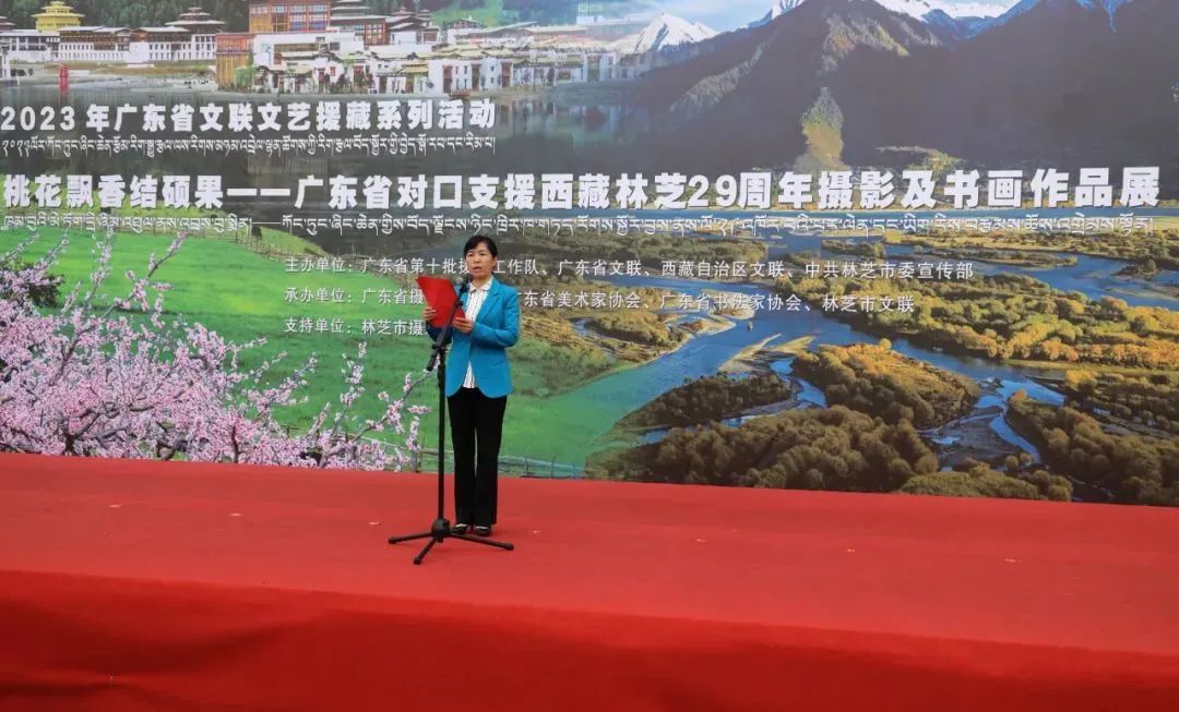 周华在开幕致辞中,对展览的主题、作品展陈情况做了介绍。她指出,本次展览以广东省对口支援西藏林芝29年,林芝地区经济、社会、生态、文化建设等各方面取得丰硕成果为主线,展出了各类摄影、美术、书法作品160件。这些作品,通过精巧的构思和独特展览叙事手法,将展览展示的内容与艺术表现深度融合,聚焦近30年来林芝发展历程,立体展现了西藏美丽独特的自然风光、多彩迷人的民族文化、一批批广东援藏干部讲奉献勇担当的鲜活形象;对粤港澳大湾区人文湾区建设成果进行精彩解读,充分表达了参展作者以艺术讴歌人民美好生活,用光影定格高质量发展的高光时刻;以多彩笔触描绘时代发展,记录乡村振兴的美丽画卷;以翰墨丹青传承经典,饱蘸浓情寄托美好祝福的创作理念,生动反映了粤藏之间的浓浓山海情,粤林人民携手同行,共同奋斗29载结出的累累硕果,给人以美好的思想启迪和情感共鸣,凸显了铸牢中华魂、画好同心圆这一重大主题,凝聚起强国建设、民族团结的磅礴力量。