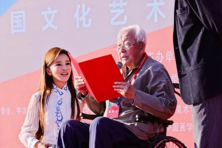 主持人盛情邀请了95岁高龄的艺术家周韶华上台致辞。周韶华在发言中向展览的召开表示热烈祝贺。表示,一部以艺术形式绘制的“一带一路”倡议的壮美画卷,将在这里呈现给世界,让世界看到中国的精彩,让中国的精彩美丽世界。