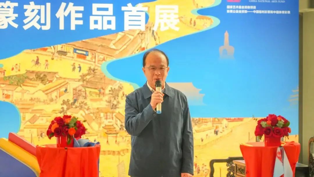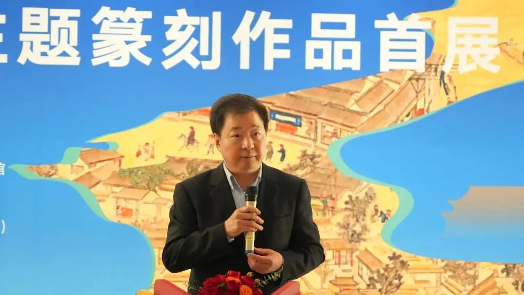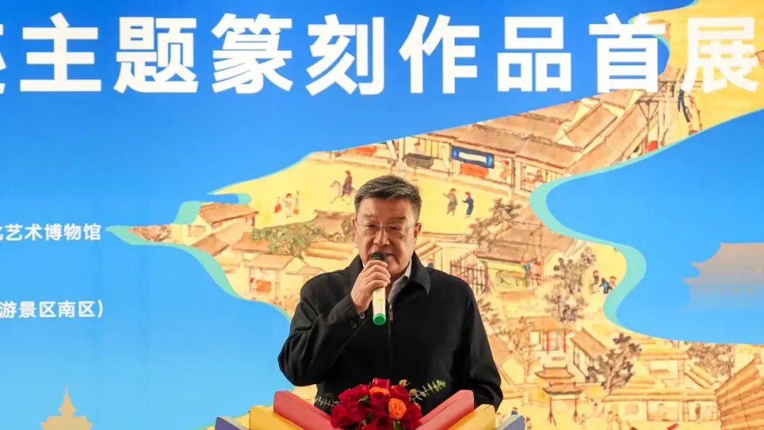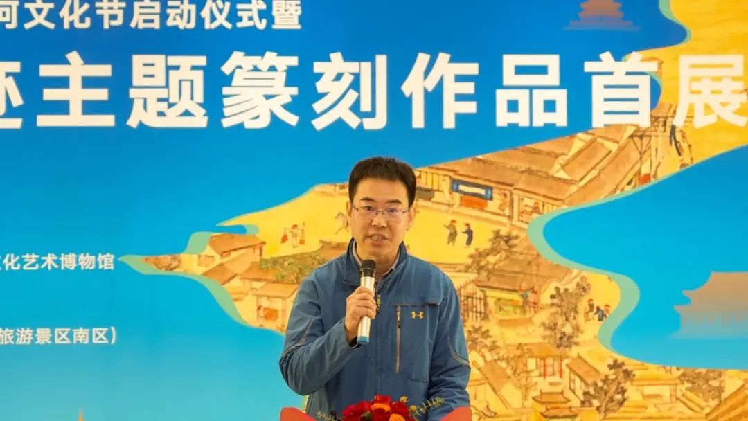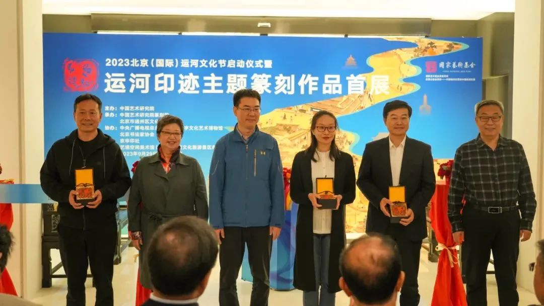 “运河印迹”主题篆刻作品首展在北京通州大运河文化旅游景区艺境空间美术馆举办。开幕式上,中共中央国务院原台办副主任周明伟,第十三届全国政协民族和宗教委员会副主任杨小波,中国艺术研究院党委副书记齐永刚,中国艺术研究院篆刻院名誉院长骆芃芃,通州区文化和旅游局局长张华,艺术家代表、北京书协副主席刘楣洪先后致辞发言,中国书法家协会主席孙晓云,中国工艺美术大师、国家非物质文化遗产铜雕技艺代表性传承人朱炳仁分别以视频的形式对本次展览的举办表示祝贺。