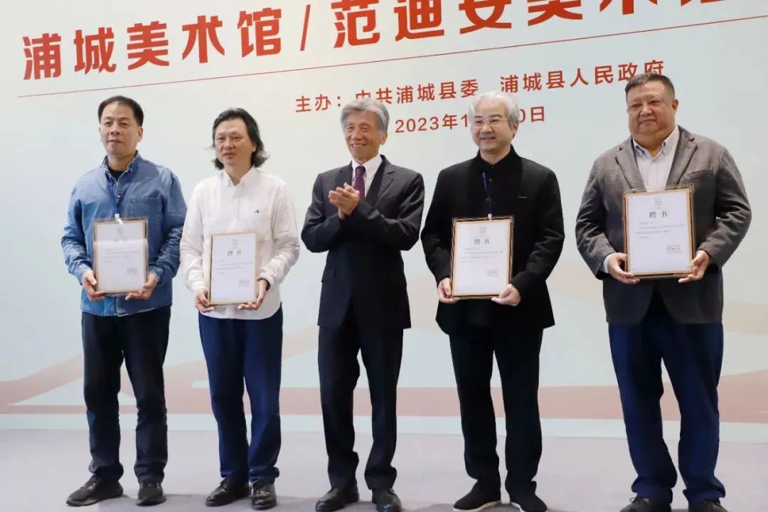 浦城县县长李江平为范迪安颁发浦城美术馆/范迪安美术馆荣誉馆长、学术委员会主任聘书。范迪安为受聘专家学者颁发浦城美术馆/范迪安美术馆学术委员会副主任聘书。最后,陈冬致辞并宣布浦城美术馆/范迪安美术馆开馆。