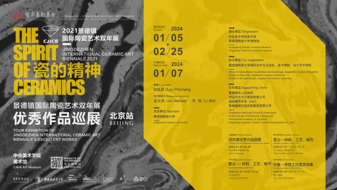 1月7日,“瓷的精神——景德镇国际陶瓷艺术双年展优秀作品巡展”(北京站)在中央美术学院美术馆开幕。此次巡展活动由景德镇陶瓷大学主办,中央美术学院美术馆、景德镇陶瓷大学博物馆承办,景德镇陶瓷大学国际合作与交流处、景德镇陶瓷大学美术学院、景德镇陶瓷大学设计艺术学院等协办。
