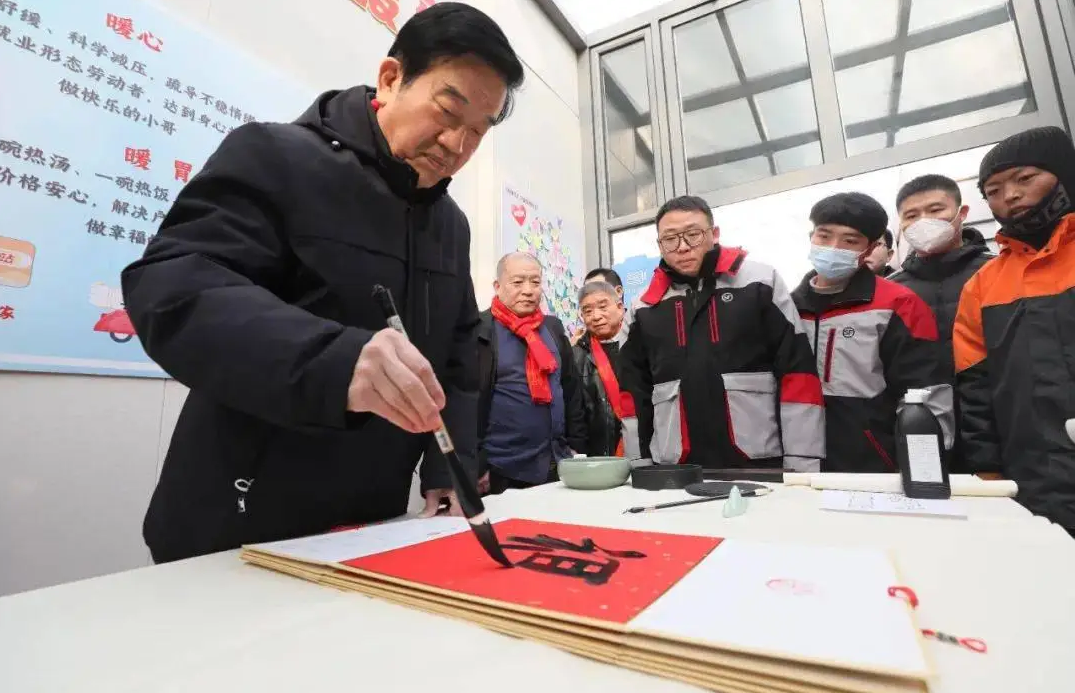 活动现场,出席领导向应邀参加活动的18位劳动模范、大国工匠、新就业形态劳动者代表赠送了“福”字。书法家们挥毫泼墨,为劳模工匠代表和一线职工书写春联和“福”字,用书法表达尊重与敬意,用笔墨传递温暖与祝福。同时,部分书法家还分别走进中国职工之家工会驿站、12351全国工会服务职工热线为快递员、外卖员、接线员赠送春联和“福”字。