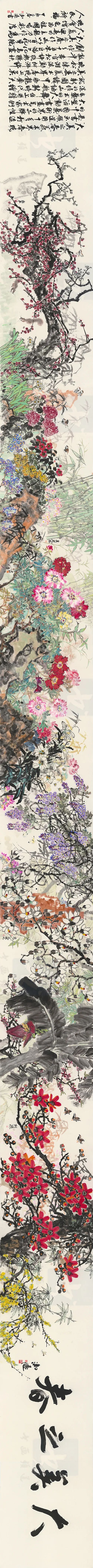 《大美之春》全卷以灵动率意的笔法,描绘了包括迎春花、木棉、桃花、芭蕉花、玉兰、紫藤、海棠、百合、茶花、牡丹、水仙以及传统的梅兰竹菊等多种花卉。作为长卷的上半部分,以迎春花、木棉常见的春花作为开篇徐徐展开,接着以芭蕉、桃花、玉兰相簇而放,又以虫鸟、少许翠竹穿插衬托,呈现一片生机盎然,万物复苏的景象。长卷中部以圆润饱满、雍容华贵的牡丹为主,与紫藤、百合的清新淡雅的气质形成呼应,寓意百花齐放、百家争鸣的时代大好局面。长卷的最后则以传统梅兰竹菊四君子收尾,表现了民在战胜艰难困苦中携手共进的团结精神与坚韧不拔的傲人品格。整幅长卷色调饱满,虚实松紧,浑然一体,展现出新时代、新气象、新格局、新观念,为美术界留下浓墨重彩的一笔。