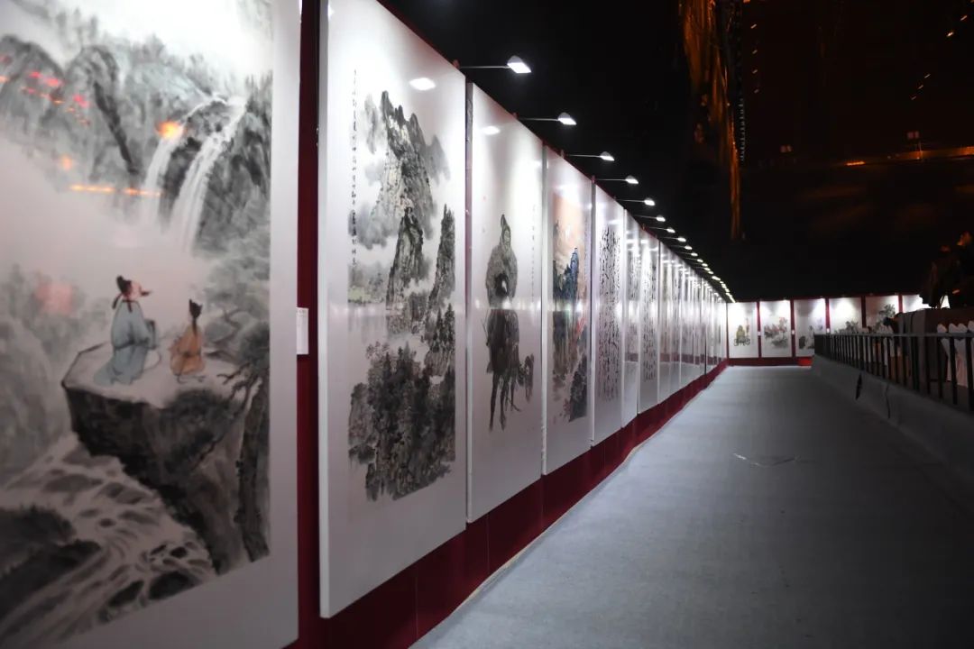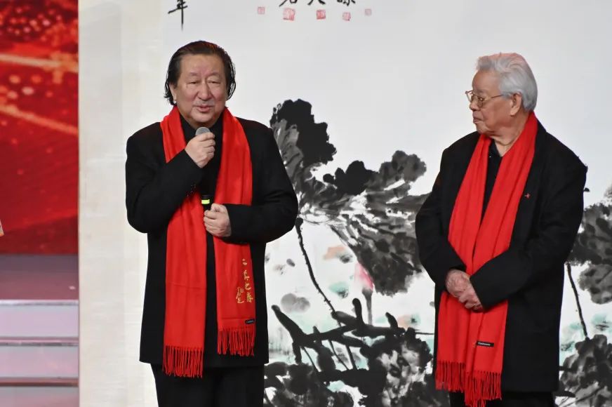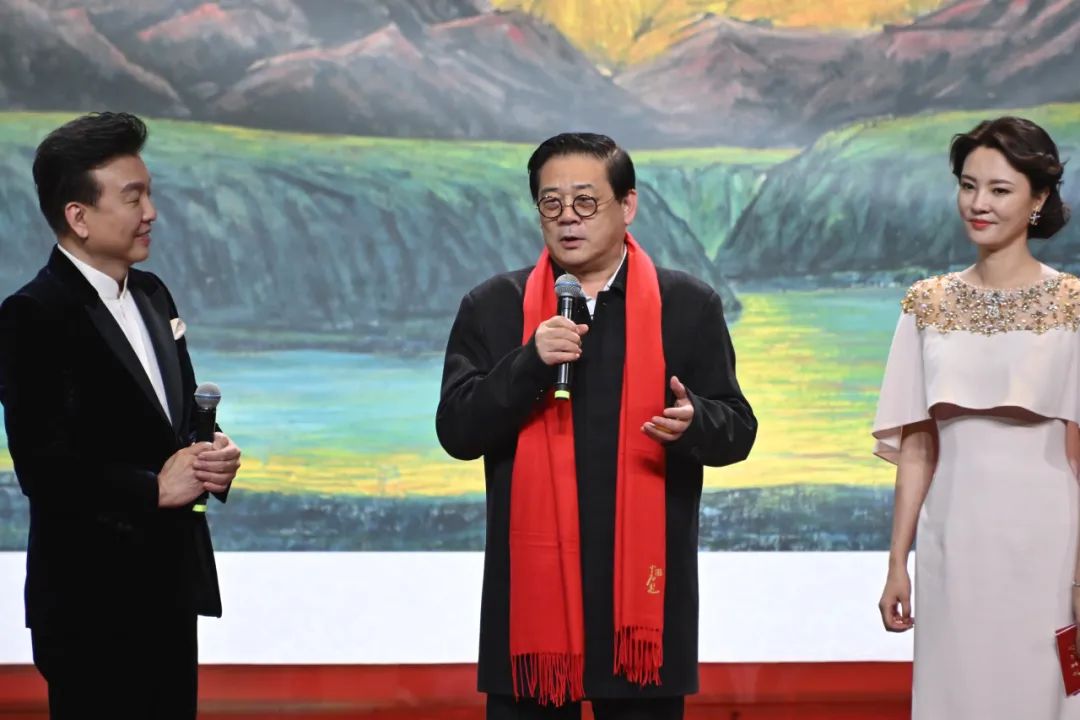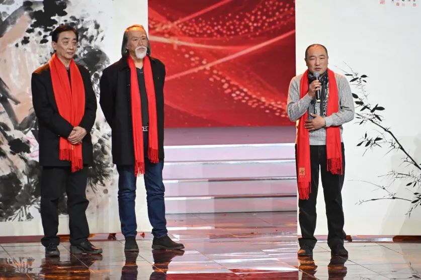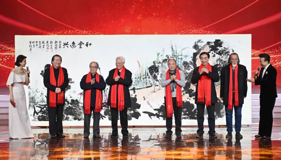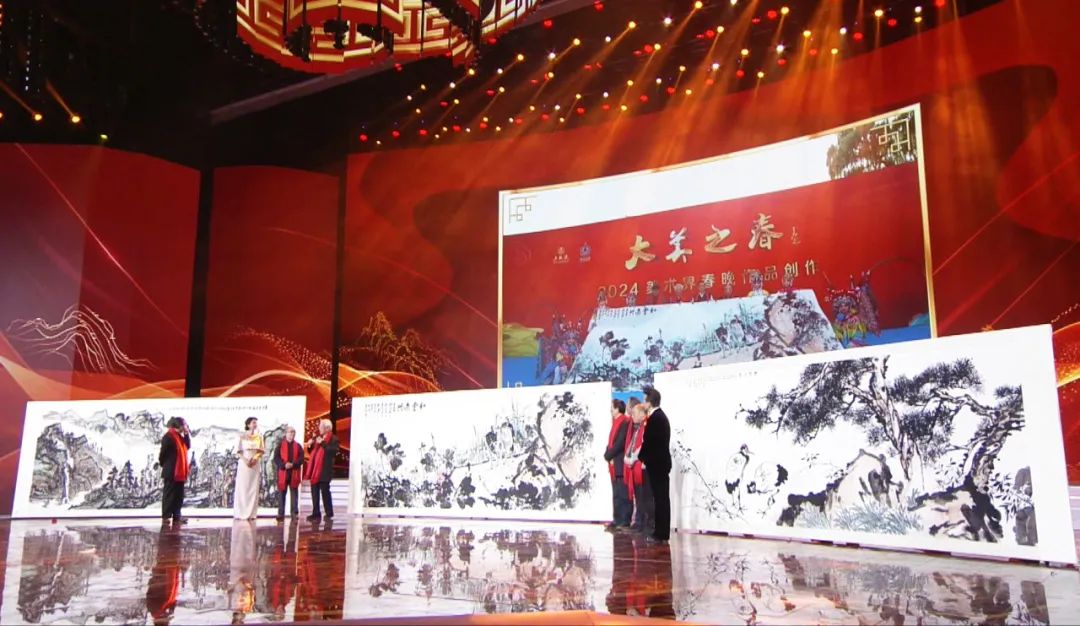 三幅由艺术名家集体创作的丈六大画,惊喜亮相舞台,他们分别是:画家杨晓阳、李宝林、尼玛泽仁、范扬、林容生带来的《青峰翠屏图》,画家卢禹舜、岳黔山、邓远坡、邢少臣创作的《群仙迎春》,以及画家张立辰、郭怡孮、吴悦石、郭石夫、徐里创作的《和堂逸兴》。艺术家代表们登台,解读画中山川与草木同歌的美妙旋律,展现了艺术家们对祖国山河万物的深沉眷恋,和对新时代美好生活的向往,并为观众送上祝福。