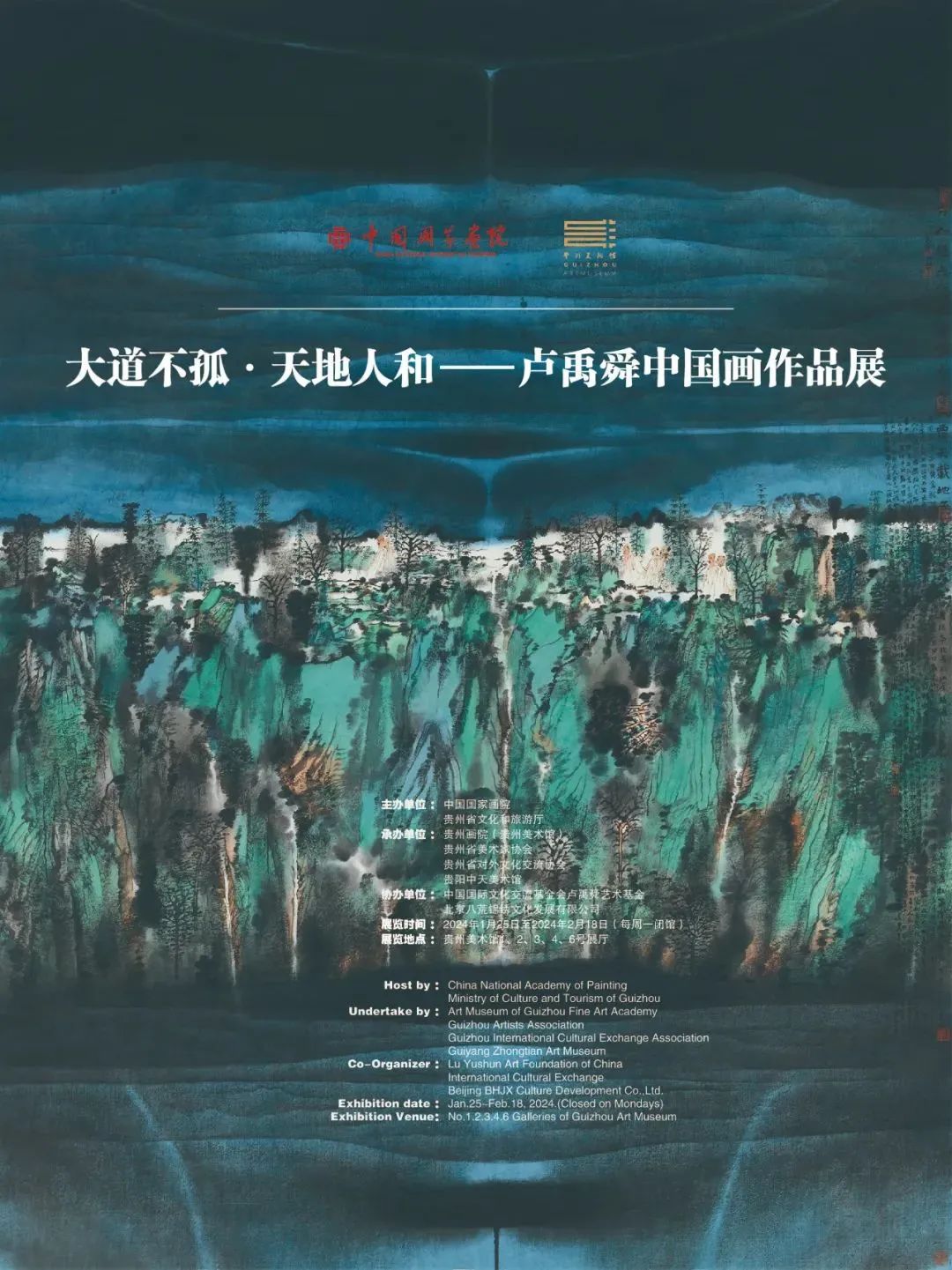 由中国国家画院、贵州省文化和旅游厅主办的“天地人和•大道不孤——卢禹舜中国画作品展”在贵州美术馆开幕。本次巡展以现场9个主题的152件作品为切口,集中梳理展示卢禹舜近10年来的创作成果,包含八荒通神、精神家园、域外写生、山海经等系列。展览以磅礴苍劲、雄浑壮美的北方山水为引, 辅以绚烂瑰丽的色彩美学、气韵生动的写意笔墨,构建出一个纳藏万象、贯通古今、天地同感、山川共鸣的艺术世界,也为观者留出体悟自然和谐吟咏,感念生命隽永律动的想象空间。