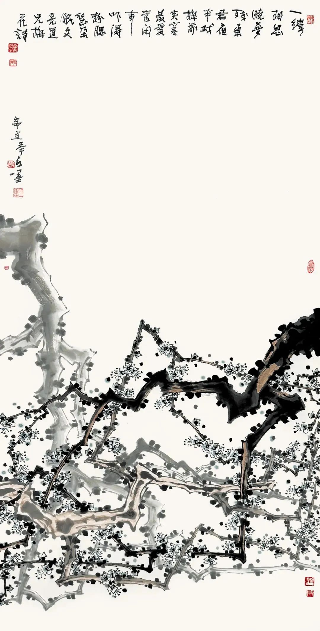 徐仲偶笔下的梅花清秀灵动,线条间穿插有度,画面充满了韵律感和设计感。他巧妙地将早年创作和空间设计感悟,融入中国书画的本土语言之中,创造性地将西方创作手法与中国书法的抽象意味相结合,表达创作者的自然心象,为梅花这一中国传统艺术主题注入了新的生命力。并以写意的手法,展现梅树枝干的蜿蜒苍劲与梅花的清新秀丽,独树一帜。他的艺术风格和表达方式,为后来的梅花创作提供了新的思路和启迪。