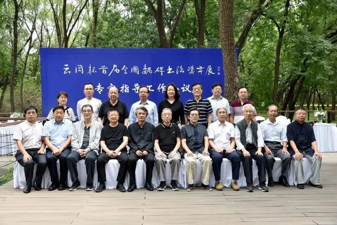 刘洪彪(前排左五)与众多书法名家莅临书画频道指导首届全国魏碑书法双年展(2020年)