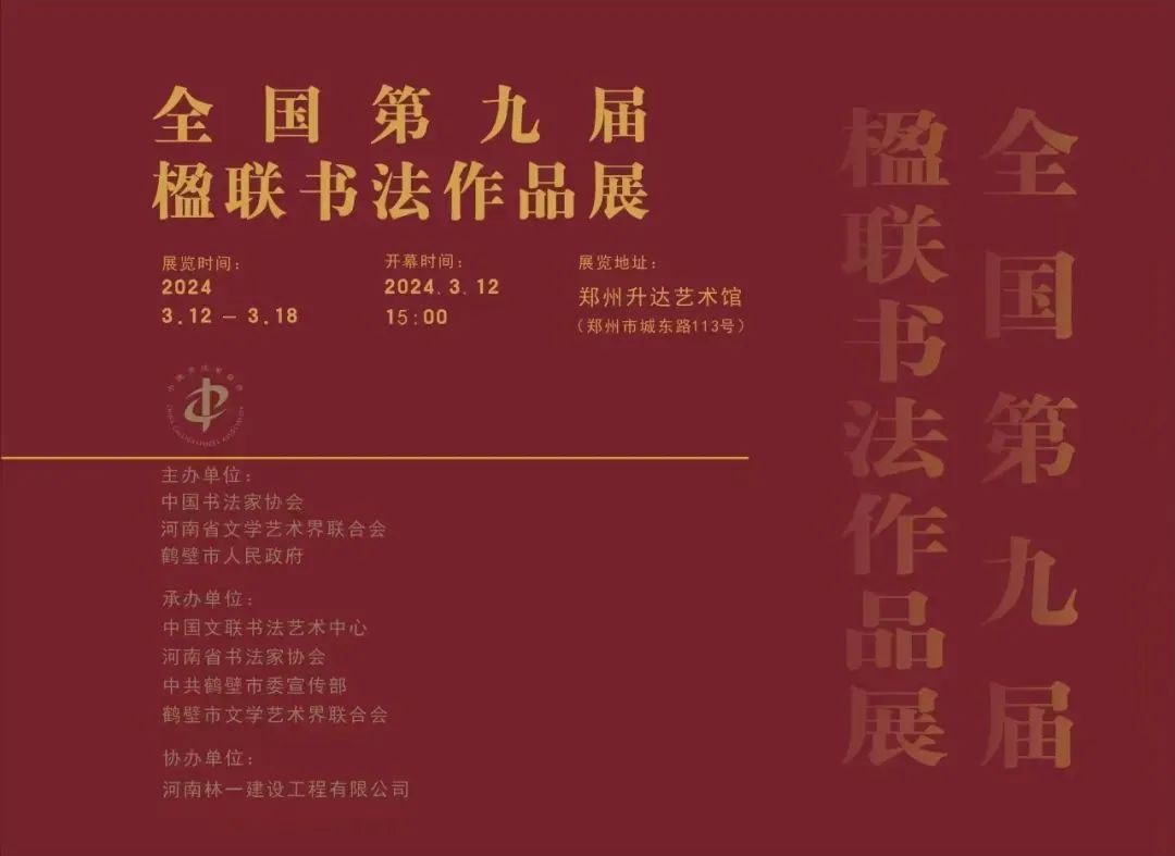 3月12日,全国第九届楹联书法作品展览在郑州开幕。展览由中国书协、河南省文联、鹤壁市人民政府主办,中国文联书法艺术中心、河南省书协、中共鹤壁市委宣传部、鹤壁市文联承办。