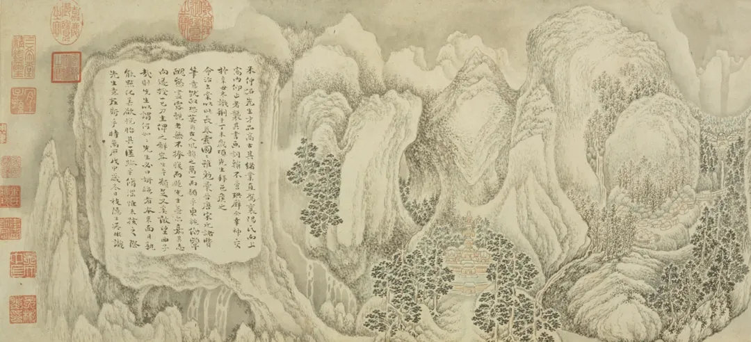 这是从画的角度,那么画的技法上他用的是什么呢?也是很奇特的一种技法。后面题跋董其昌提到了,用的孙位画火法。董其昌在题跋里用了五个方面,就是我们常说的“五行”(水、火、土、木、金)来判断这件东西:皴法是用的是火法,是孙位画火法;势态(线条) 是水,咱们看到原件的话就很清楚,确实是像流淌的水;山脊就是金,劲头的刚劲,那就是金;山峰,大家看图就能看到它一共有九个主峰,加上副峰一共是十三个,可以说是山峰林立,这就是木;画坡陀其实就是土。所以董其昌从这五个方面对这幅作品做了一个很高的评判评价。