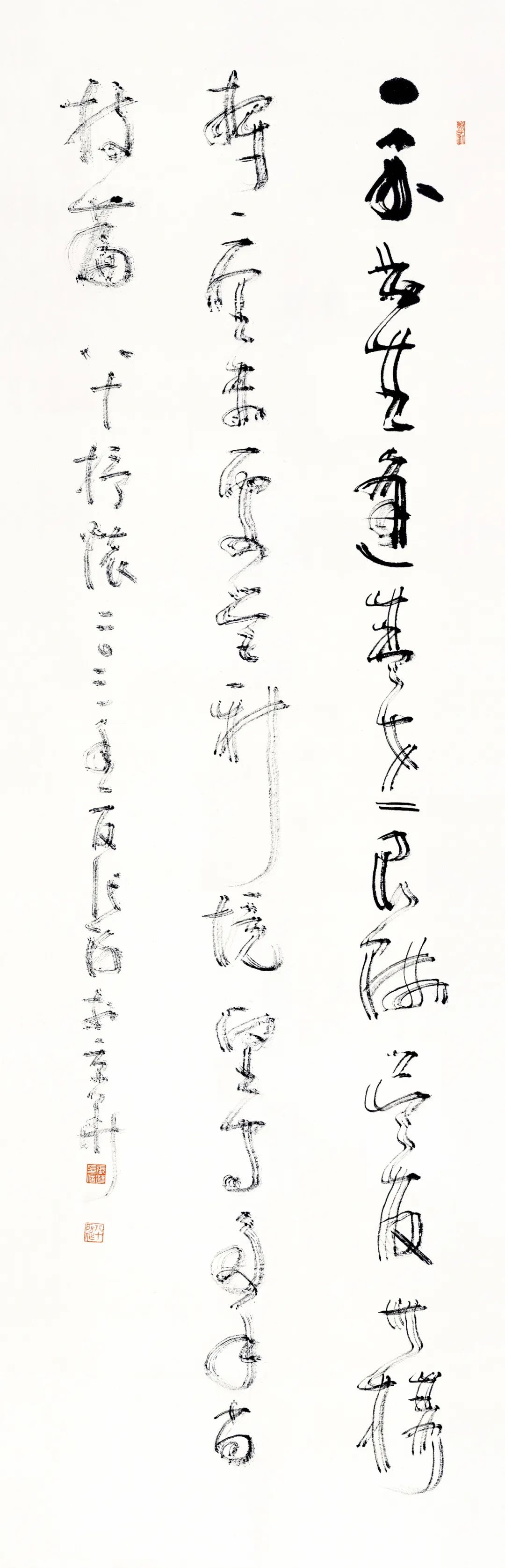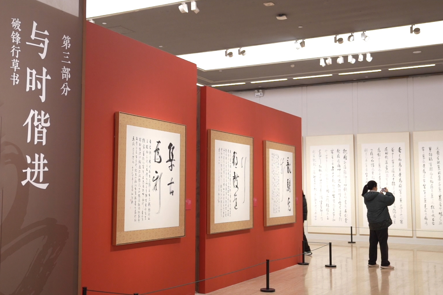 第九展厅为“与时偕进”主题展厅,集中展出以“破锋”个性语言为主特征的行草书法,或字大如斗,或鸿篇巨制,洋洋洒洒,满壁云烟。以《宋词四首》和《张先诗词两首》为代表的破锋行草书,展示了浓墨过渡为破锋的过程,线条墨色的变化,体现出黑白灰调子关系,在自然书写中,通过轻重提按和因势利导的笔锋运用,驾驭了破锋散笔艺术表现力,因线条分散形成的空间具有现代意义上的构成之美。
