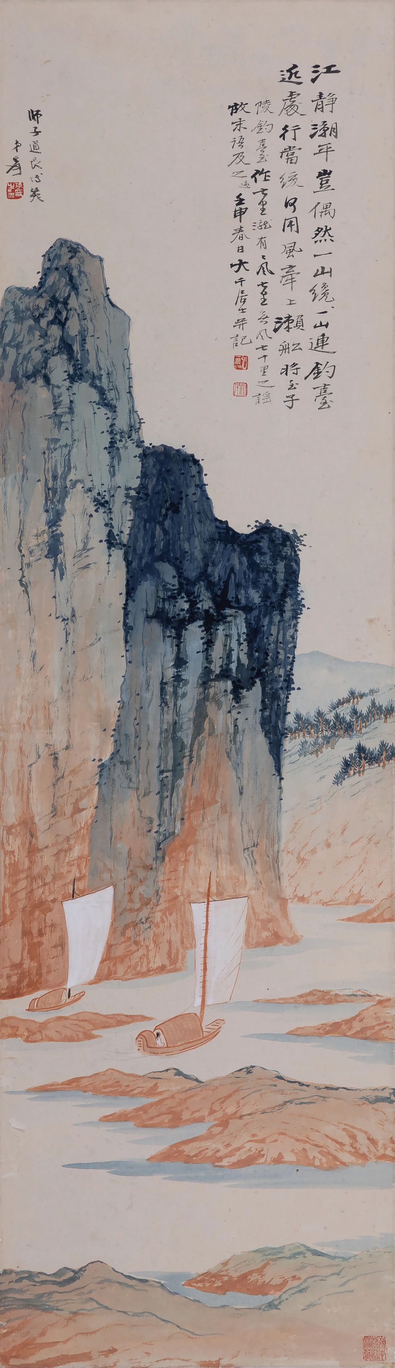 沈周的《为吴宽作层峦叠嶂图》是展览中最引人注目的作品之一。吸引了无数观众的目光与赞叹。沈周以其深厚的笔墨功底和超凡的构图能力,展现了一幅气势磅礴、层次分明的山水画卷。无论是巍峨的山峰、茂密的树林,还是潺潺的流水、飘渺的云雾,他巧妙地运用墨色的浓淡干湿,以及线条的粗细曲直,将山水的形态与质感表现得淋漓尽致。此外,近代绘画大师张大千的《赤壁泛舟》则以其独特的色彩运用和构图技巧,展现了一幅别具一格的赤壁图景。画中的赤壁高耸入云,江水波涛汹涌,一叶扁舟在江面上悠然荡漾。营造出了一种既雄浑又清新的艺术氛围。刘海粟的《九上黄山》则以大气磅礴的笔触和浓烈的色彩,展现了黄山的雄伟与壮丽。画中的黄山奇峰耸立,云海翻腾,仿佛是一幅立体的山水画卷。