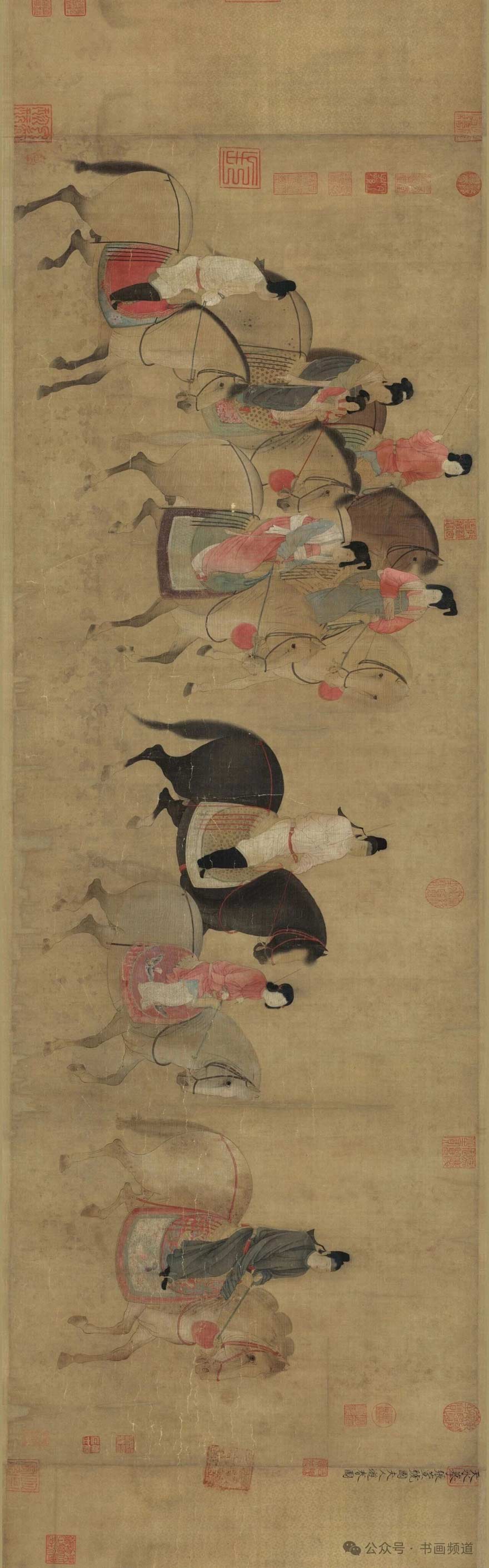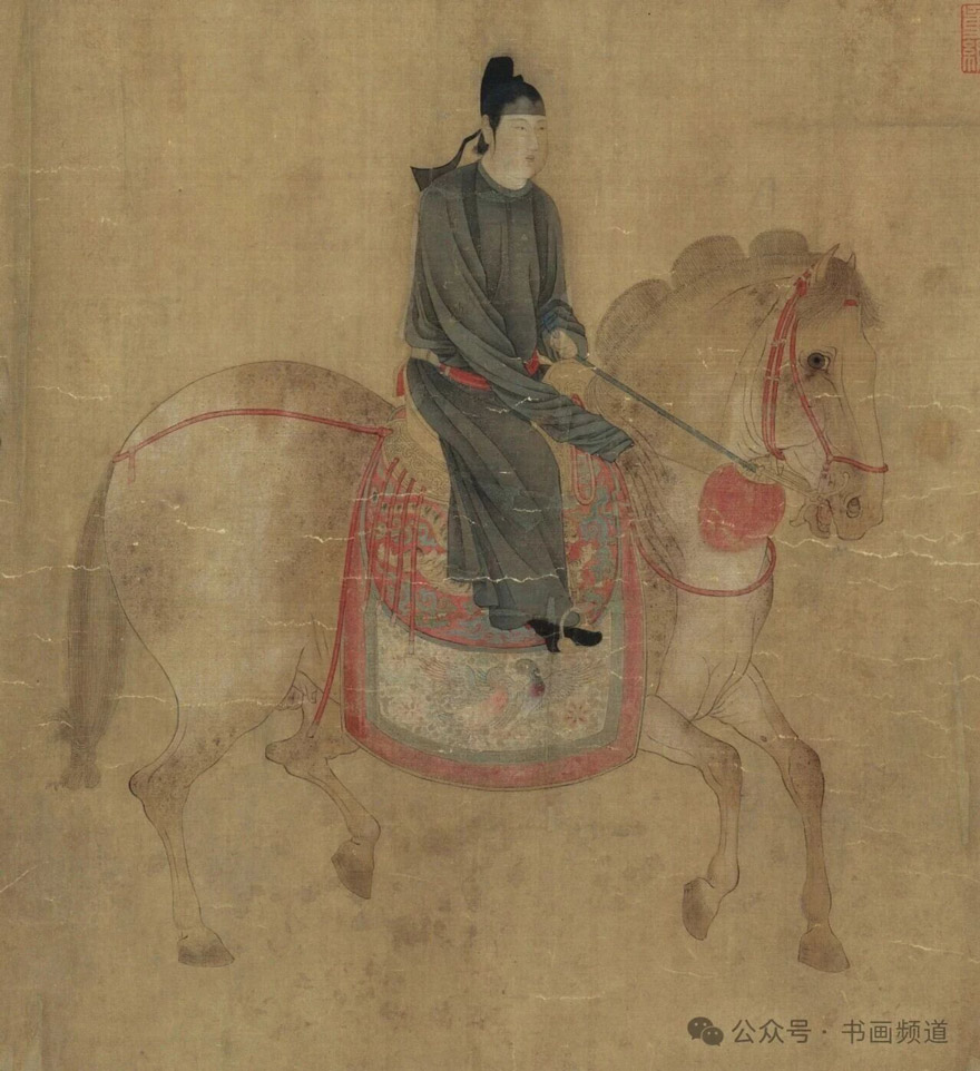 背景虽无繁复的山水景致,却以留白的手法,让观者的目光全然聚焦于人与马的互动,仿佛能听见春日里的笑语声,随风飘散在长安的街头巷尾。