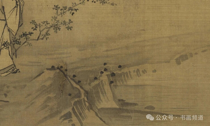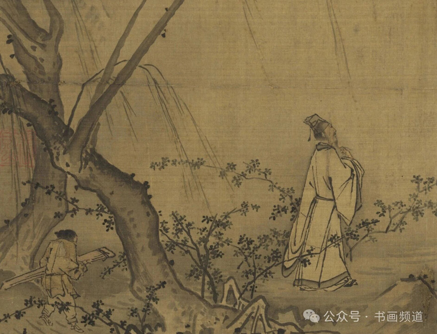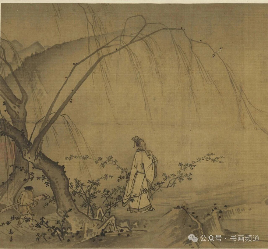 马远的绘画素有“一角”之称,这幅《山径春行图》也不例外,画面右侧留白充足,左侧景物密集,虚实相生间,营造出“山重水复疑无路,柳暗花明又一村”的意境。画中的高士,没有盛唐贵族的华贵,却多了几分文人的淡泊与超然。他的春游,无关身份与排场,只为亲近自然、聆听心声,在春日的山林间,寻一份内心的宁静与自在。这种“游目骋怀,足以极视听之娱”的心境,恰是宋代文人春游的核心——以游春养性,以自然养心。