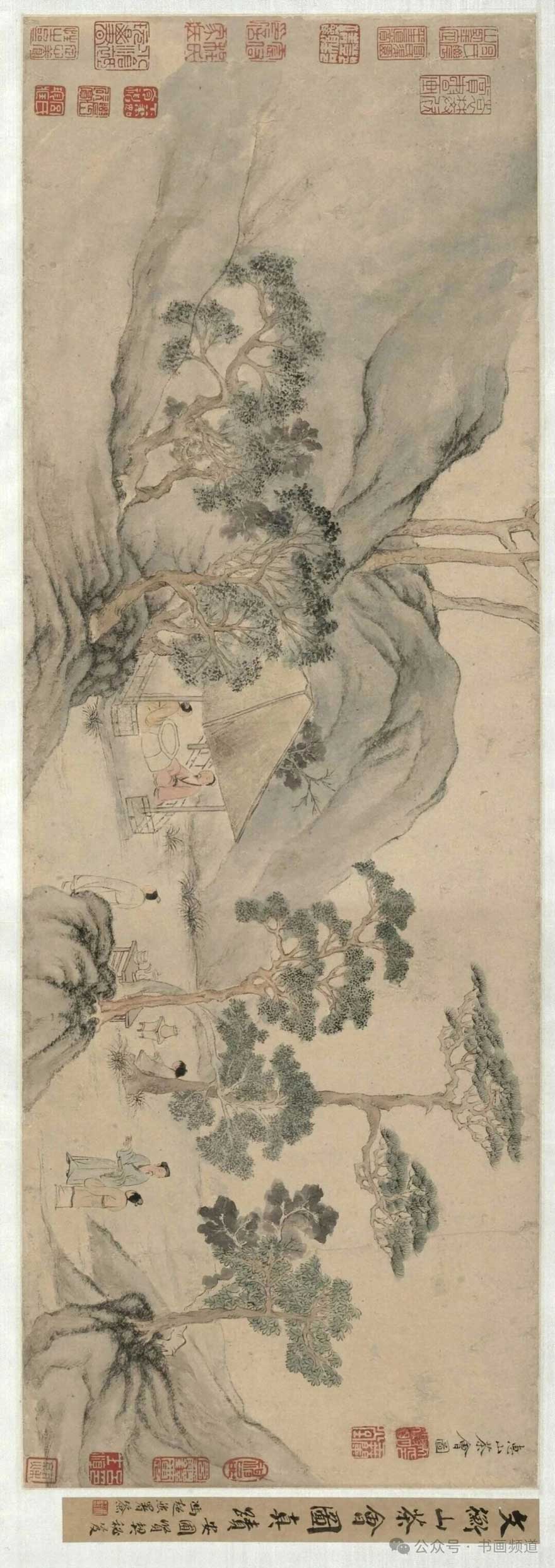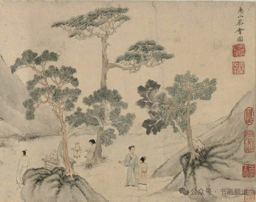 明代的春游,更添几分文人雅集的闲适,文徵明的《惠山茶会图》,便是一场春日文人雅集的生动记录,将春日的茶趣、诗趣与闲情,展现得淋漓尽致。这幅画现藏故宫博物院,描绘了清明时节,文徵明与友人在惠山品茶赏春的场景,充满了生活气息与文人意趣。
