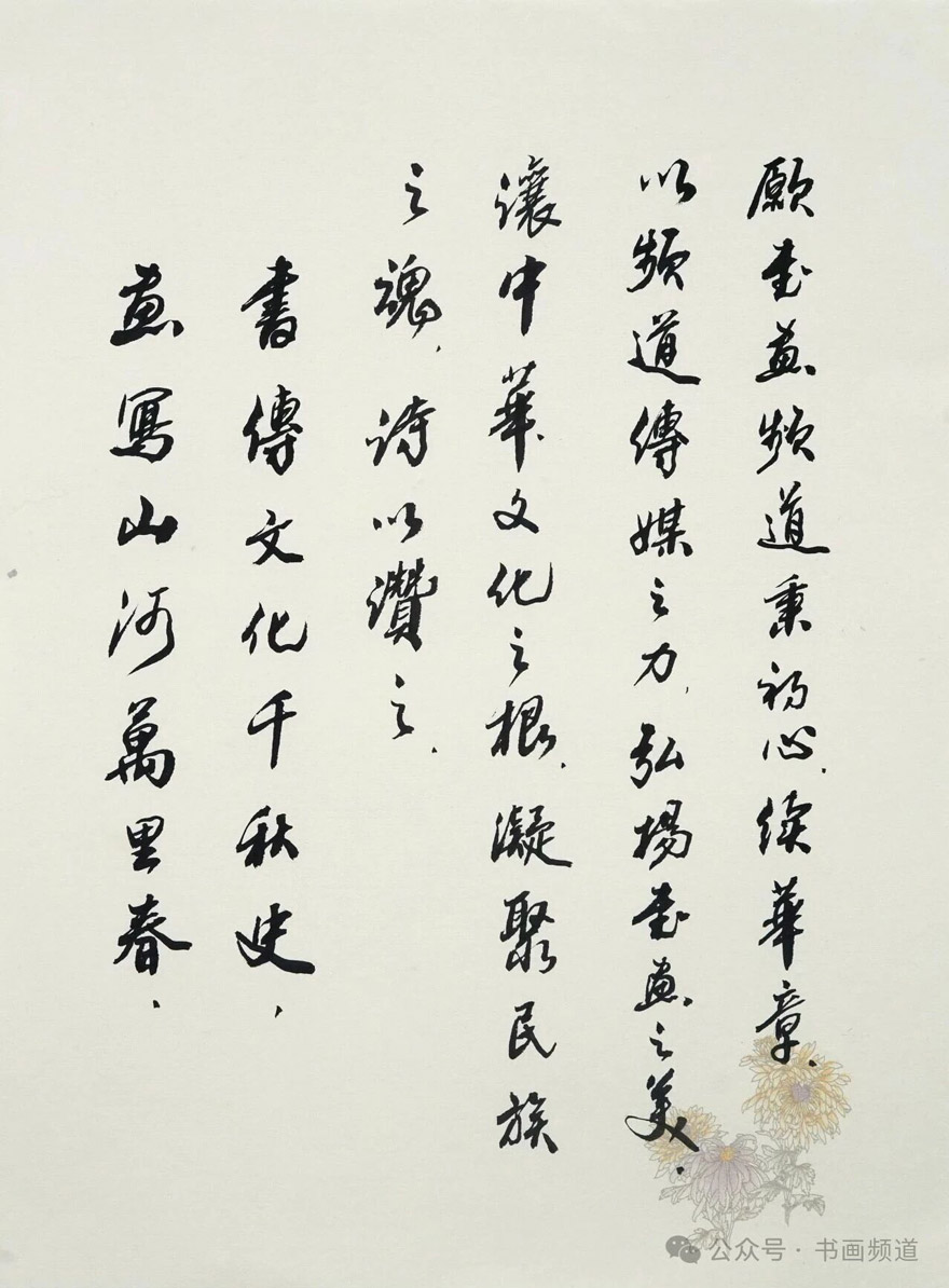嗟夫!过去已为历史,未来尚待创新。展望未来,频道执书画以拓天地;立足当下,书画融时代而畅人心。初衷如磐,中华文化必征新旅;使命在肩,艺术文明启迪后人。再捧真情,情盈丹青世界;更凝挚爱,爱聚翰墨乾坤。