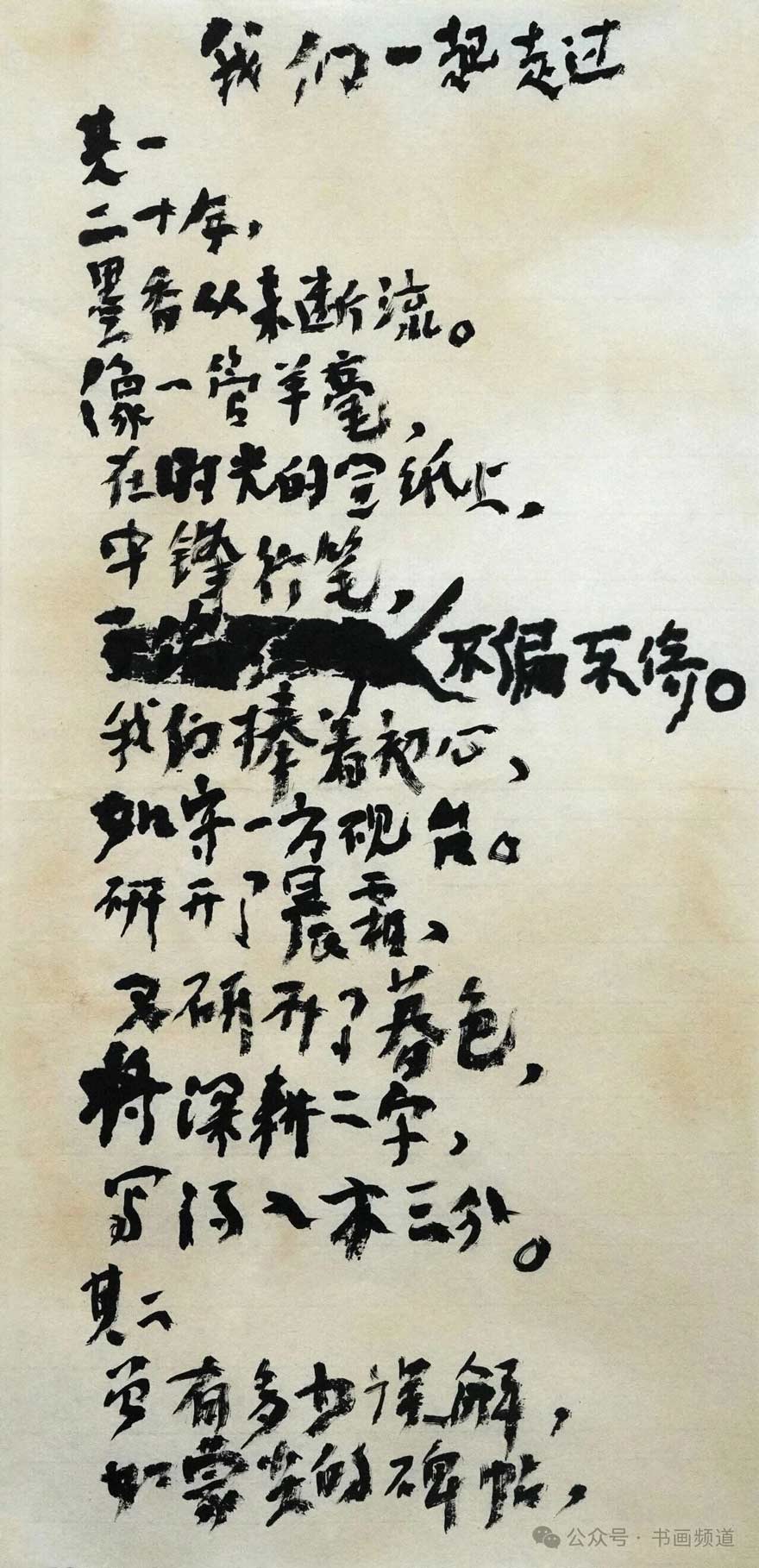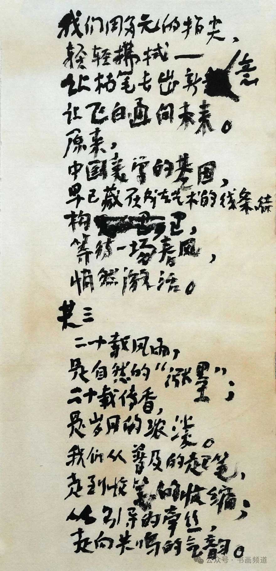 书画频道走过二十年,可圈可点的事情数不完,人称书画之家不虚传,宣传书画经典推出书画人才作贡献,驰骋书画界半边天。每日美术新闻不中断,传播中央精神、各地书画新闻争相看,激励书画家进步是加油站,鼓历(励)各地不断推出新活动争相干。深入农村厂矿城市举办书画活动开新篇,活动结合当地实际人民群众拍手赞,人言一味复制经典大家爱,我言传统融入实际创出群众喜爱的作品是模范,深入基层活动我曾参加一二三,博览自然景观,受到群众启迪,写生创(作)心中暖,做劳动人民的学生,走和工农兵结合道路方向正路子端。最是日常活动规矩办,每逢春节为干部群众写春联,大美之春已成为书画的乐园,推陈出新自编自演,展览书画家自己的作品书画爱好者喜欢,这给书画界增添了节日乐趣,成为广泛受欢迎的品牌与样板。