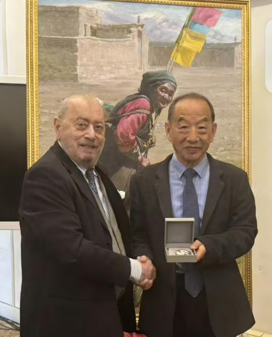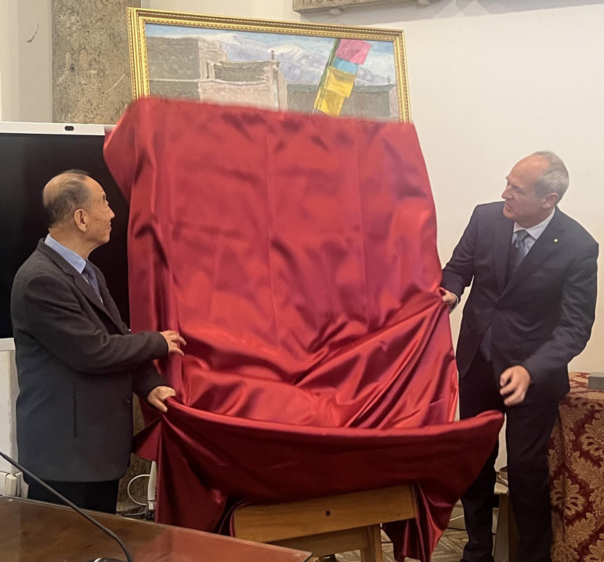 意大利杜奇基金会对此次活动给予了全力支持,主席保罗向韩玉臣授予“基金会荣誉委员”徽章,以表彰其对意中文化艺术交流做出的贡献。罗马市政府礼仪部部长贾科佩洛,向韩玉臣颁发“罗马建成2776 年纪念奖章”,并与其共同为捐赠作品《老阿妈与风马旗》揭幕。