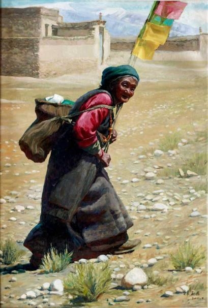 风马旗是西藏宗教文化中的一个符号,一个象征,寓意人们对吉祥安康的祈愿。韩玉臣此幅作品,生动描绘了一个洋溢着幸福微笑的老阿妈,手持多彩风马旗,躬腰缓步前行的感人形象,韩玉臣说:“这幅作品寓意对罗马人民的衷心祝福。”